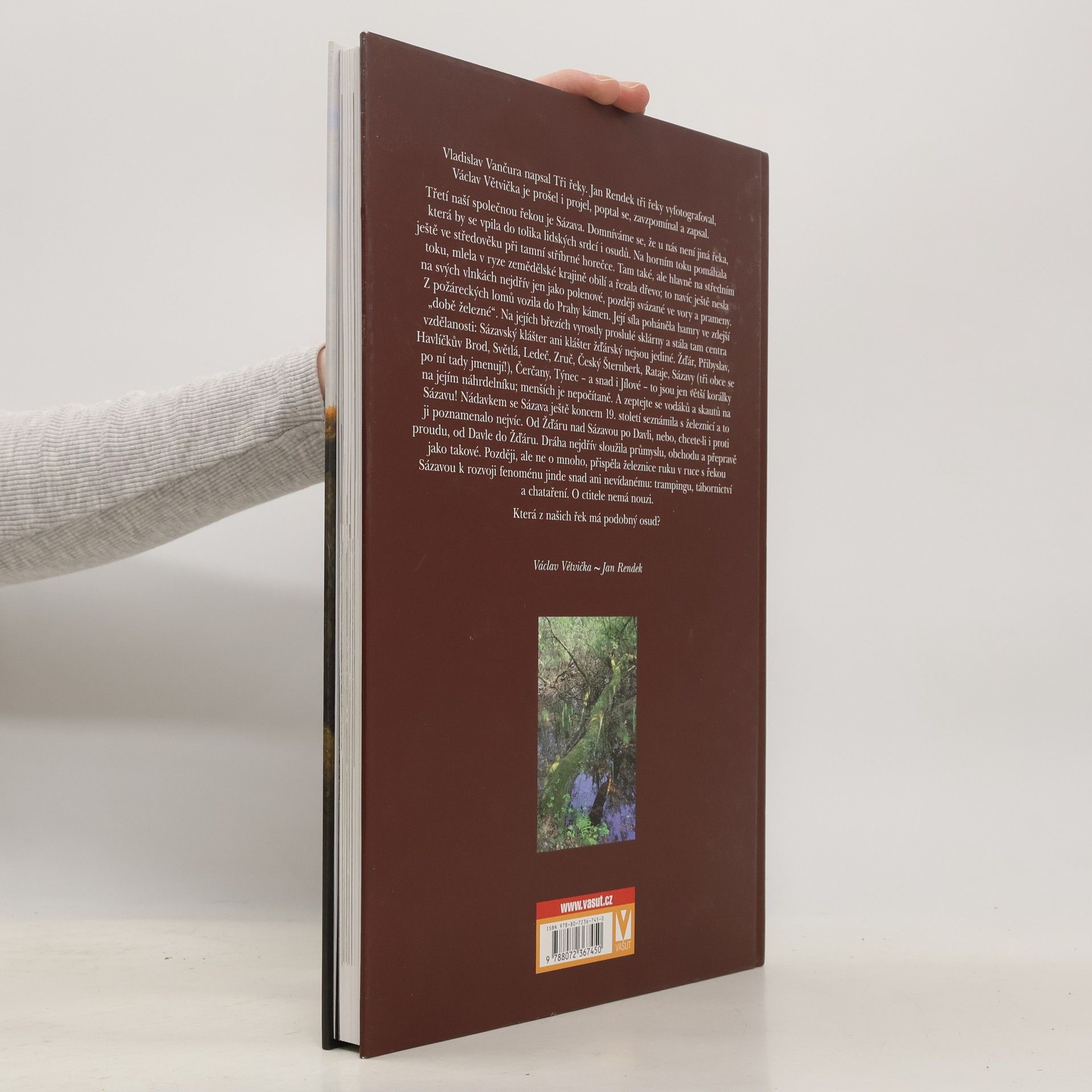 Vladislav Vančura napsal Tři řeky, Jan Rendek je vyfotografoval a Václav Větvička je prošel, projel, zavzpomínal a zapsal. Třetí společnou řekou je Sázava, která se vpila do mnoha lidských srdcí a osudů. Na horním toku pomáhala během středověké stříbrné horečky, zatímco na středním toku mlela obilí a řezala dřevo, které nesla na svých vlnkách, nejprve jako polena a později ve vory. Z požáreckých lomů vozila do Prahy kámen a její síla poháněla hamry v „době železné“. Na jejích březích vyrostly proslulé sklárny a vzdělanostní centra, jako Sázavský a Žďárský klášter. Města jako Žďár, Přibyslav, Havlíčkův Brod, Světlá a další jsou jen větší korálky na jejím náhrdelníku. Sázava se také na konci 19. století seznámila s železnicí, což ji významně poznamenalo. Dráha sloužila průmyslu a obchodu, později přispěla k rozvoji trampingu, tábornictví a chataření. Sázava má mnoho ctitelů a její osud je jedinečný. Která z našich řek se může pochlubit podobným příběhem?