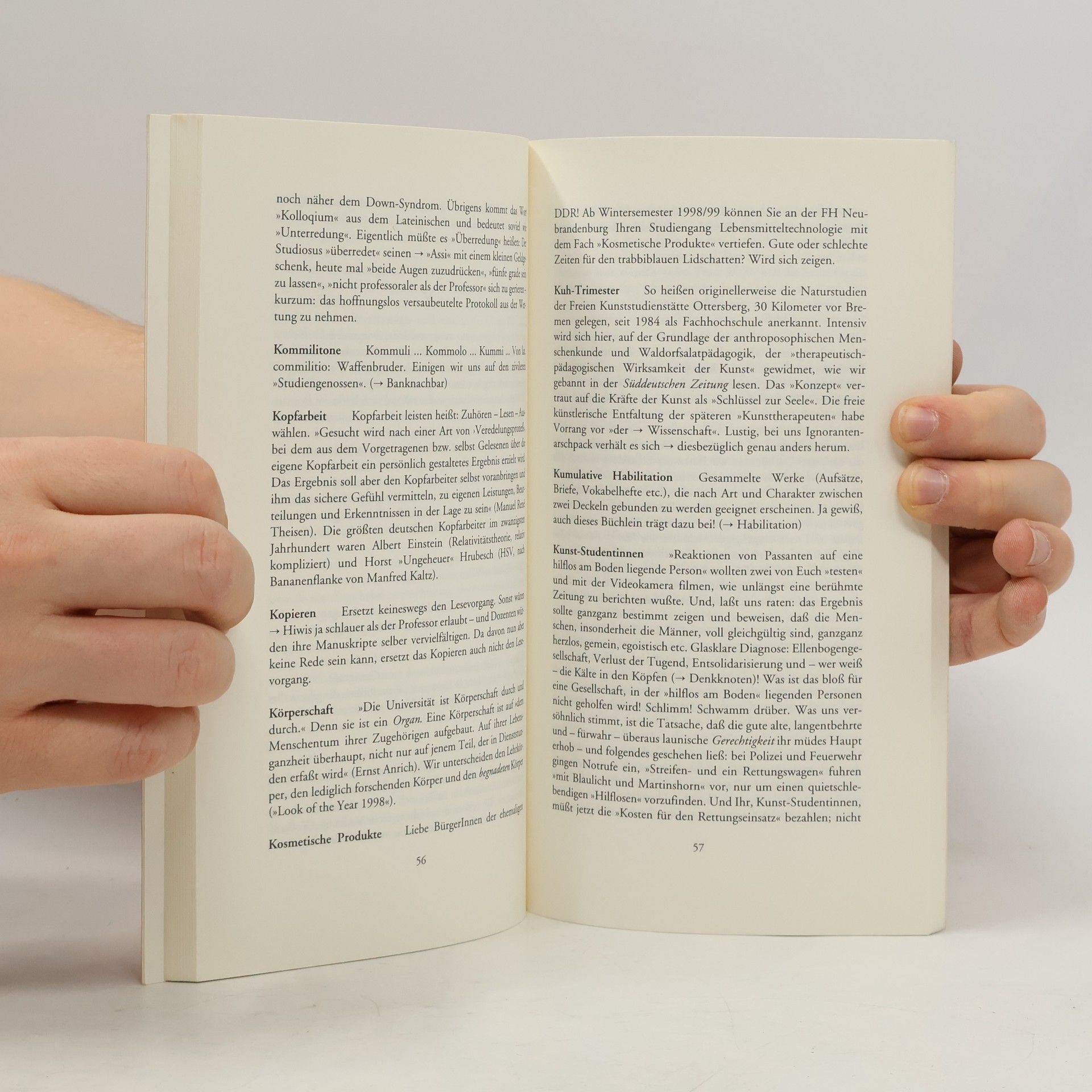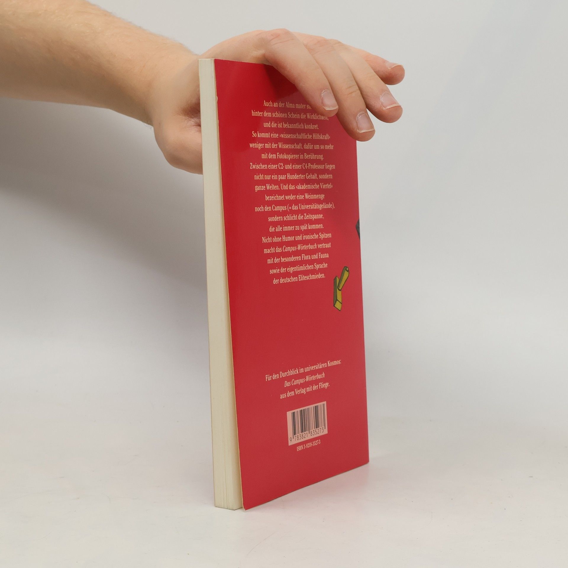 Auch an der Alma mater steckt hinter dem schönen Schein die Wirklichkeit, und die ist bekanntlich konkret. So kommt eine "wissenschaftliche Hilfskraft" weniger mit der Wissenschaft, dafür aber umsomehr mit dem Fotokopierer in Berührung. Zwischen einer C2- und einer C4-Professur liegen nicht nur ein paar Hunderter Gehalt, sondern ganze Welten. Und das "akademische Viertel" bezeichnet weder eine Weinmenge noch den Campus (=das Universitätsgelände), sondern schlicht die Zeitspanne, die alle immer zu spät kommen. Nicht ohne Humor und ironische Spitzen macht das "Campus-Wörterbuch" vertraut mit der besonderen Flora und Fauna sowie der eigentümlichen Sprache der deutschen Eliteschmieden.
