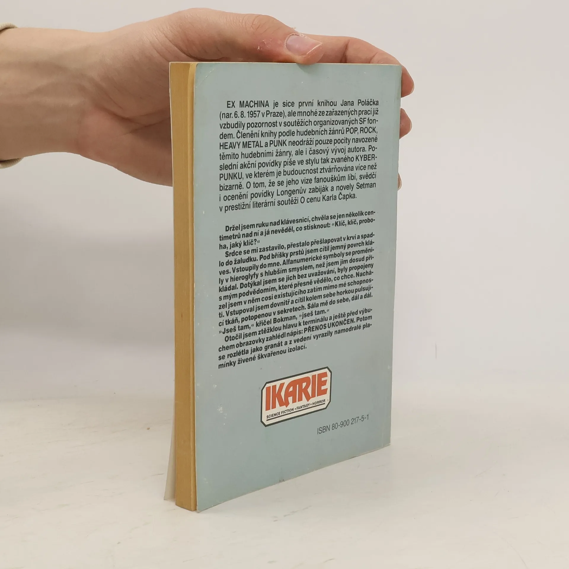 Ex machina je sice první knihou Jana Poláčka, ale mnohé ze zařazených prací již vzbudily pozornost v soutěžích organizovaných SF fondem. Členění knihy podle hudebních žánru Pop, Rock, Heavy Metal a Punk neodráží pouze pocity navozené těmito hudebními žánry, ale i časový vývoj autora. Poslední akční povídky píše ve stylu tak zvaného Kyberpunku, ve kterém je budoucnost ztvárňována více než bizarně. O tom, že se jeho fanouškům líbí, svědčí i ocenění povídky Longenův zabiják a novely Setman v prestižní literární soutěži O cenu Karla Čapka.... celý text