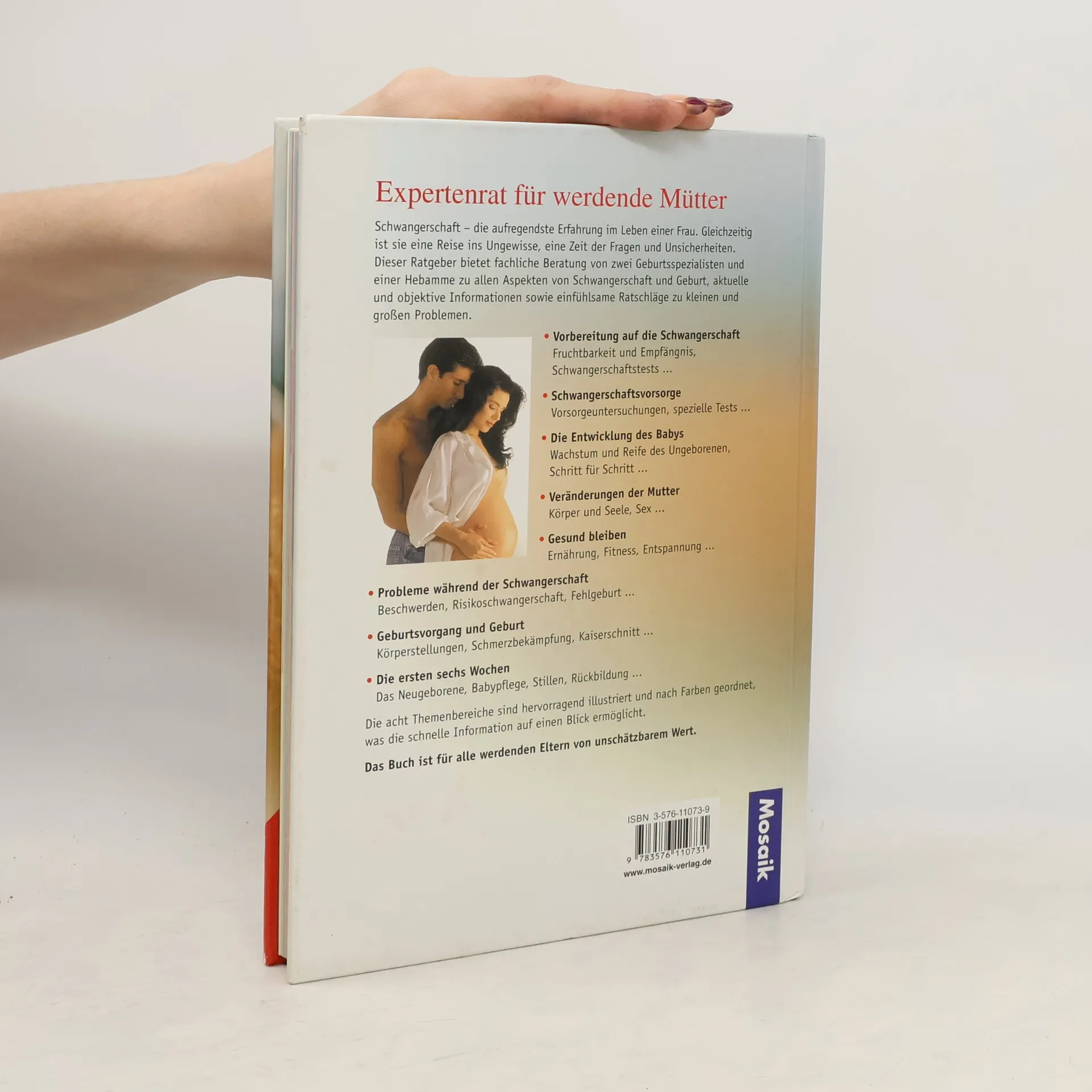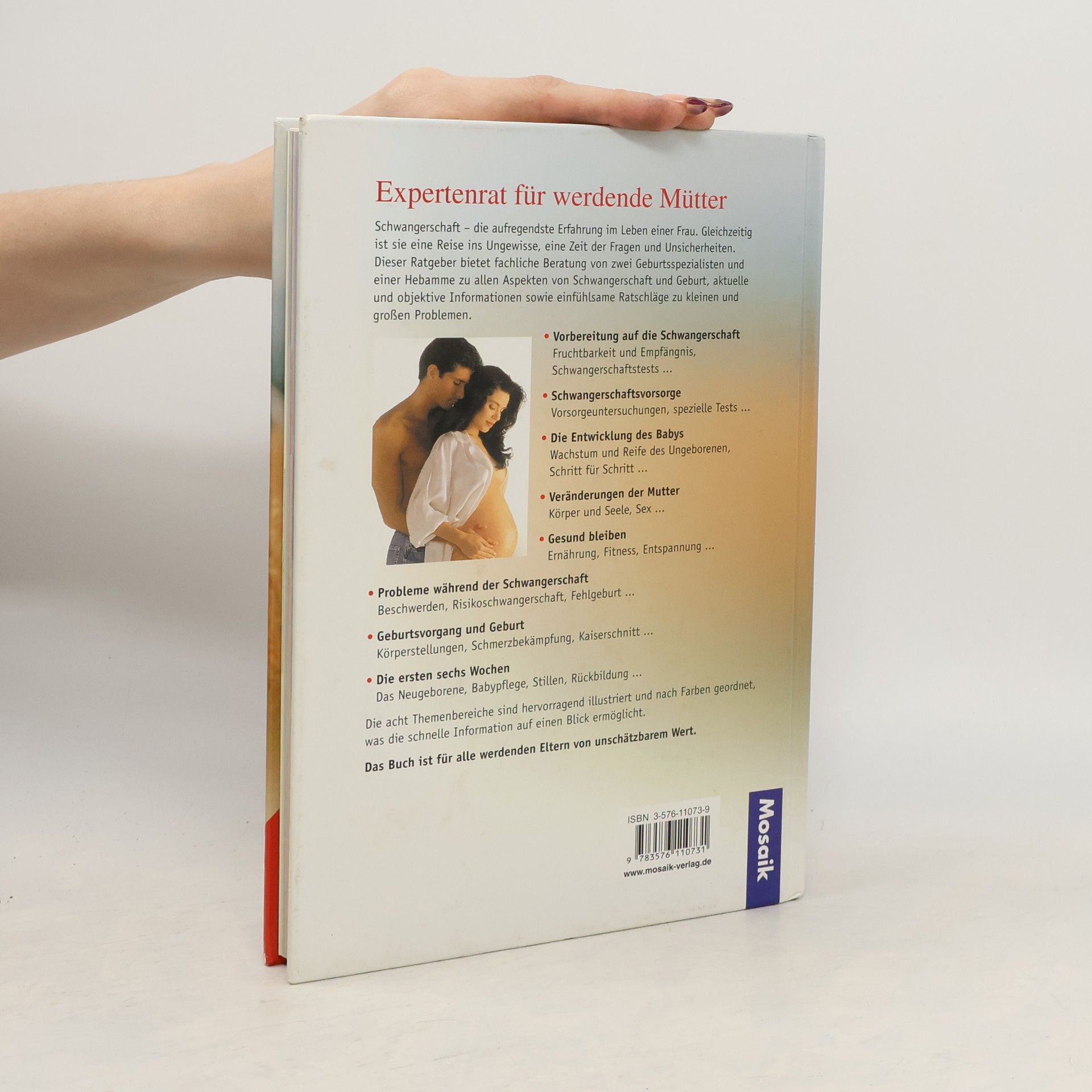 Kann Ultraschall meinem Baby schaden? Warum bekomme ich Rückenschmerzen? Wie werde ich mich nach der Geburt fühlen? Dieser bewährte DK-Ratgeber bietet Expertenrat zu allen Fragen rund um Empfängnis, Schwangerschaft, Geburt und die ersten sechs Lebenswochen. Auf Basis aktueller Forschungen erhält der Leser fundierte Beratung durch zwei Geburtsspezialisten und eine Hebamme. Das Buch schafft Klarheit bei medizinischen und psychologischen Fragen und beugt Unsicherheiten vor. Es liefert neueste Informationen zu künstlicher Befruchtung, Risikoschwangerschaften, Krankheiten bei Neugeborenen, AIDS und vielem mehr. Informative Extra-Kapitel gibt es zu Ernährung, seelischem Befinden, Fitness und Sex während der Schwangerschaft.