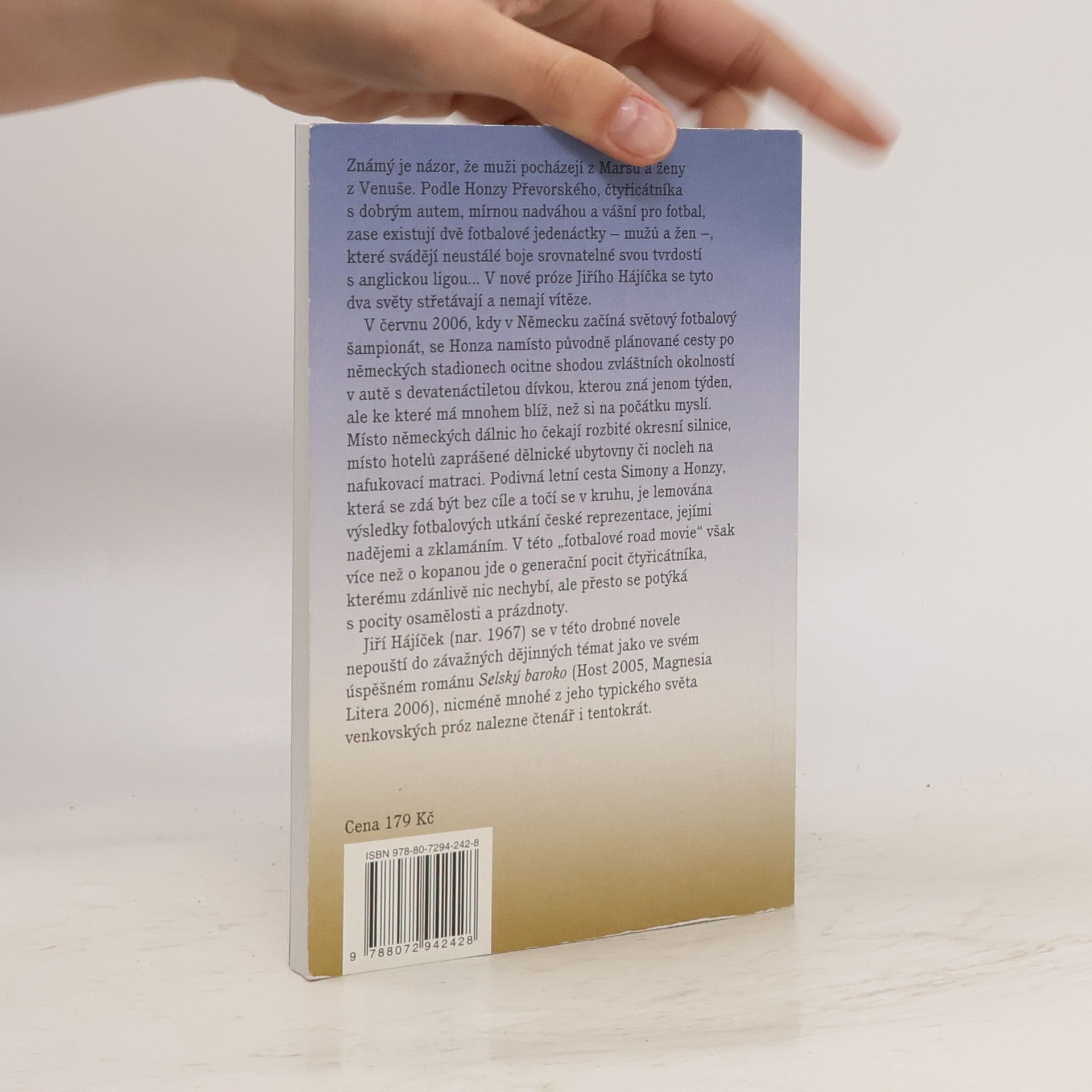 Známý je názor, že muži pocházejí z Marsu a ženy z Venuše. Podle Honzy Převorského, čtyřicátníka s dobrým autem, mírnou nadváhou a vášní pro fotbal, zase existují dvě fotbalové jedenáctky – mužů a žen –, které svádějí neustálé boje srovnatelné svou tvrdostí s anglickou ligou... V nové próze Jiřího Hájíčka se tyto dva světy střetávají a nemají vítěze. V červnu 2006, kdy v Německu začíná světový fotbalový šampionát, se Honza namísto původně plánované cesty po německých stadionech ocitne shodou zvláštních okolností v autě s devatenáctiletou dívkou, kterou zná jenom týden, ale ke které má mnohem blíž, než si na počátku myslí. Místo německých dálnic ho čekají rozbité okresní silnice, místo hotelů zaprášené dělnické ubytovny či nocleh na nafukovací matraci. Podivná letní cesta Simony a Honzy, která se zdá být bez cíle a točí se v kruhu, je lemována výsledky fotbalových utkání české reprezentace, jejími nadějemi a zklamáním. V této „fotbalové road movie" však více než o kopanou jde o generační pocit čtyřicátníka, kterému zdánlivě nic nechybí, ale přesto se potýká s pocity osamělosti a prázdnoty. Jiří Hájíček se v této drobné novele nepouští do závažných dějinných témat jako ve svém úspěšném románu Selský baroko (2005), nicméně mnohé z jeho typického světa venkovských próz nalezne čtenář i tentokrát.