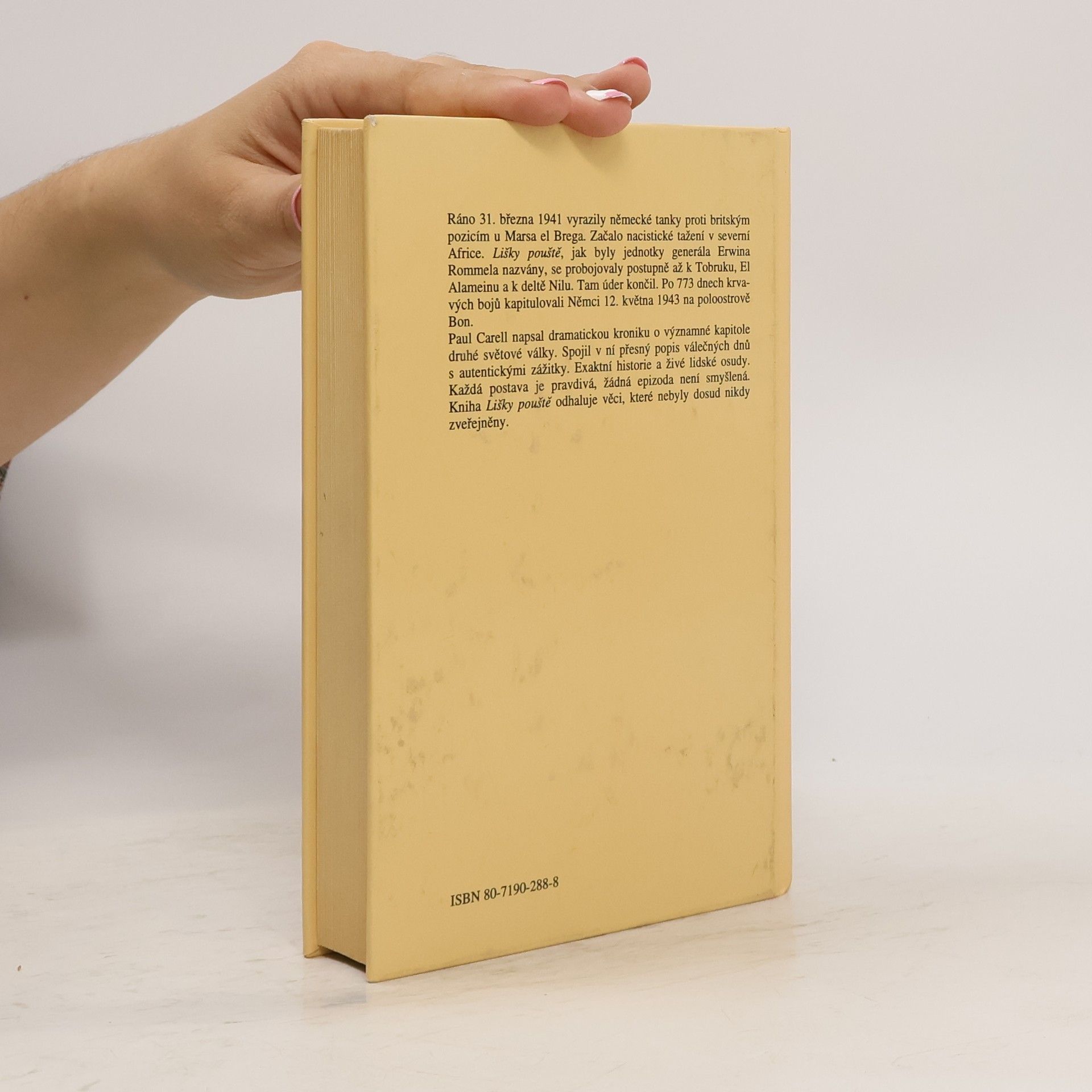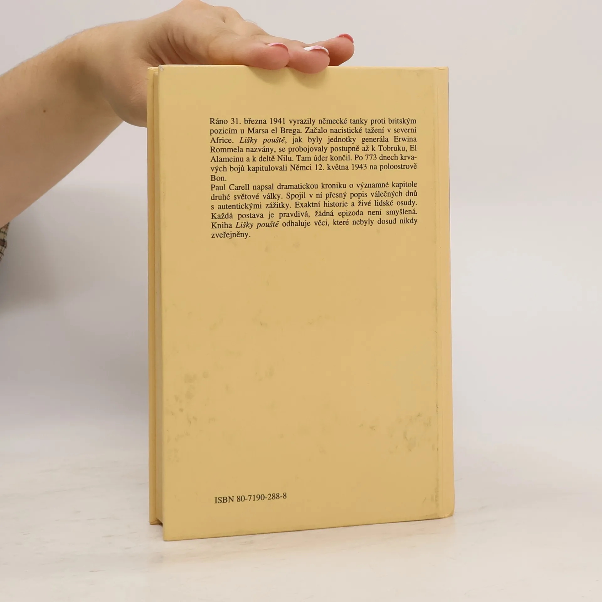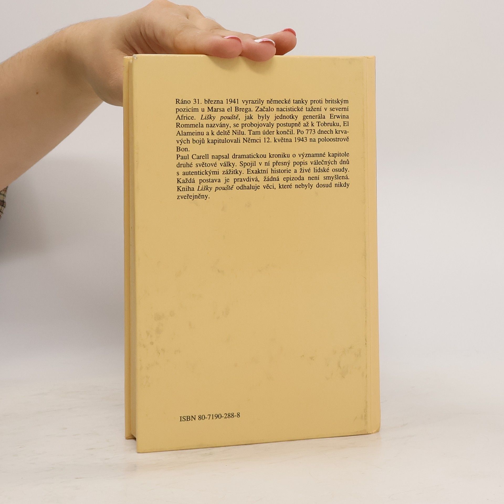 Velmi podrobná kronika událostí, jež se odehrály v průběhu invaze německé armády generála Rommela v oblasti severní Afriky. Ráno 31. března 1941 vyrazily německé tanky proti britským pozicím u Marsa el Brega. Začalo nacistické tažení v severní Africe. Lišky pouště, jak byly jednotky generála Erwina Rommela nazvány, se probojovaly postupně až k Tobruku, El Alameinu a k deltě Nilu. Tam úder končil. Po 773 dnech krvavých bojů kapitulovali Němci 12. května 1943 na poloostrově Bon.Paul Carrel napsal dramatickou kroniku o významné kapitole druhé světové války. Spojil v ní přesný popis válečných dnů s autentickými zážitky. Exaktní historie a živé lidské osudy. Každá postava je pravdivá, žádná epizoda není smyšlená. Kniha Lišky pouště odhalila věci, které do té doby nikdo nezveřejnil.