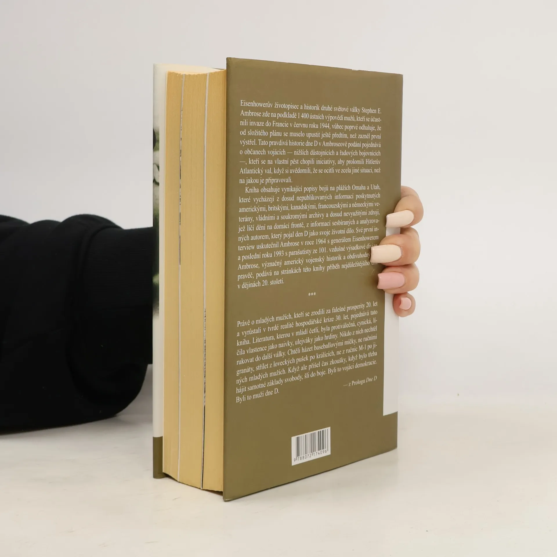 Eisenhowerův životopisec a historik druhé světové války Stephen E. Ambrose v knize na základě 1 400 ústních výpovědí účastníků invaze do Francie v červnu 1944 odhaluje, že se muselo od složitého plánu upustit ještě před prvním výstřelem. Autor se zaměřuje na občany a vojáky, kteří, když si uvědomili, že se ocitli v nečekané situaci, se chopili iniciativy, aby prolomili Hitlerův Atlantický val. Kniha obsahuje vynikající popisy bojů na plážích Omaha a Utah, vycházející z dosud nepublikovaných informací. Ambrose, významný americký vojenský historik a vypravěč, přináší příběh nejdůležitějšího dne v dějinách 20. století. Dále se kniha zaměřuje na mladé muže, kteří vyrostli v době falešné prosperity 20. let a tvrdé reality hospodářské krize 30. let. Literatura, kterou četli, byla protiválečná a cynická, a nikdo z nich nechtěl jít do další války. Chtěli hrát baseball, ne bojovat. Když však přišel čas zkoušky a bylo třeba bránit svobodu, šli do boje. Byli to vojáci demokracie, muži dne D.