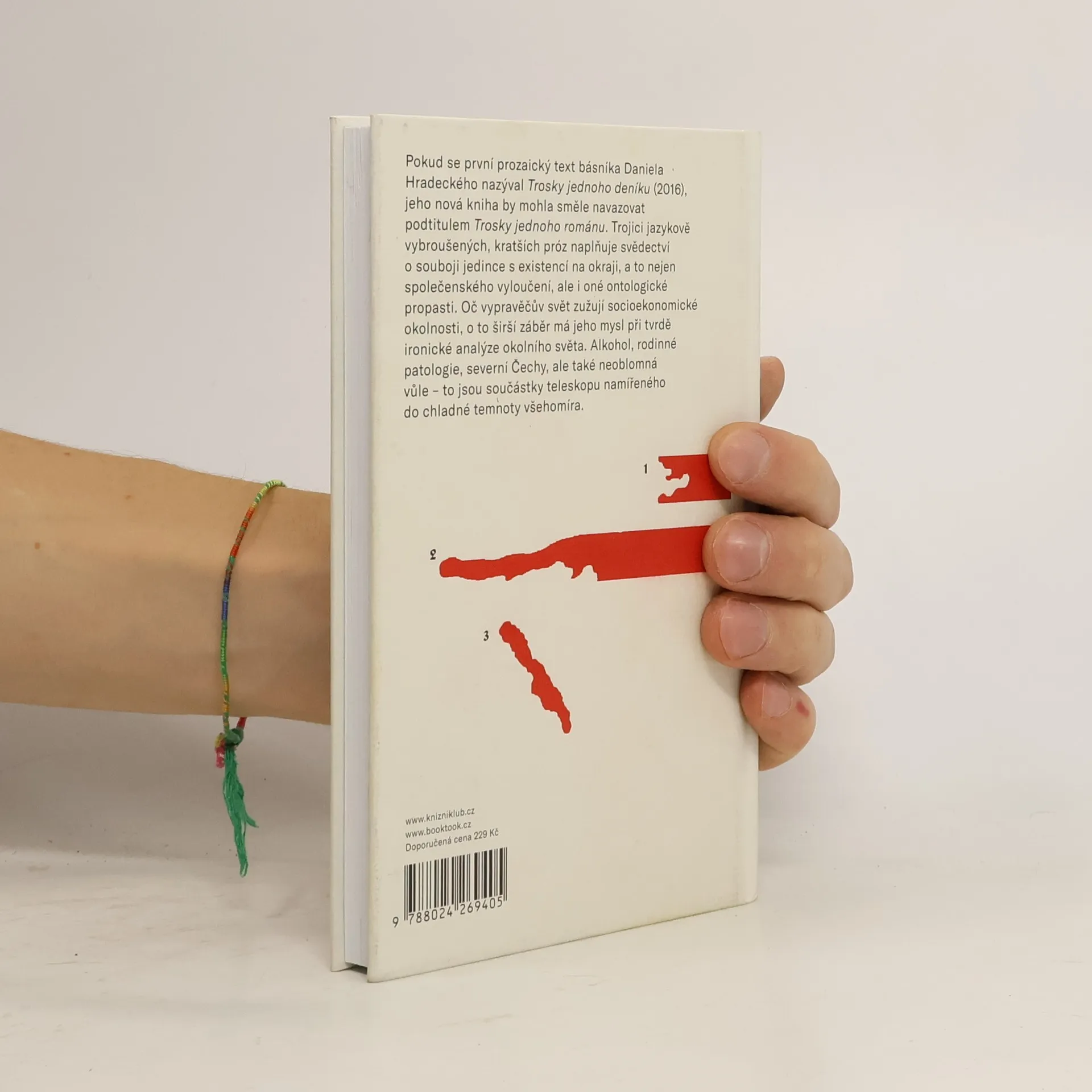 Pokud se první prozaický text básníka Daniela Hradeckého nazýval Trosky jednoho deníku, jeho nová próza by mohla směle navazovat podtitulem Trosky jednoho románu. Trojici jazykově vybroušených, kratších próz naplňuje svědectví o souboji jedince s existencí na okraji, a to nejen společenského vyloučení, ale i oné ontologické propasti. Oč je vypravěčův svět zúženější okolnostmi, o to širší záběr má jeho mysl při tvrdě ironické analýze okolního světa. Alkohol, rodinné patologie, severní Čechy, ale také neoblomná vůle – to jsou součástky teleskopu namířeného do chladné temnoty všehomíra.