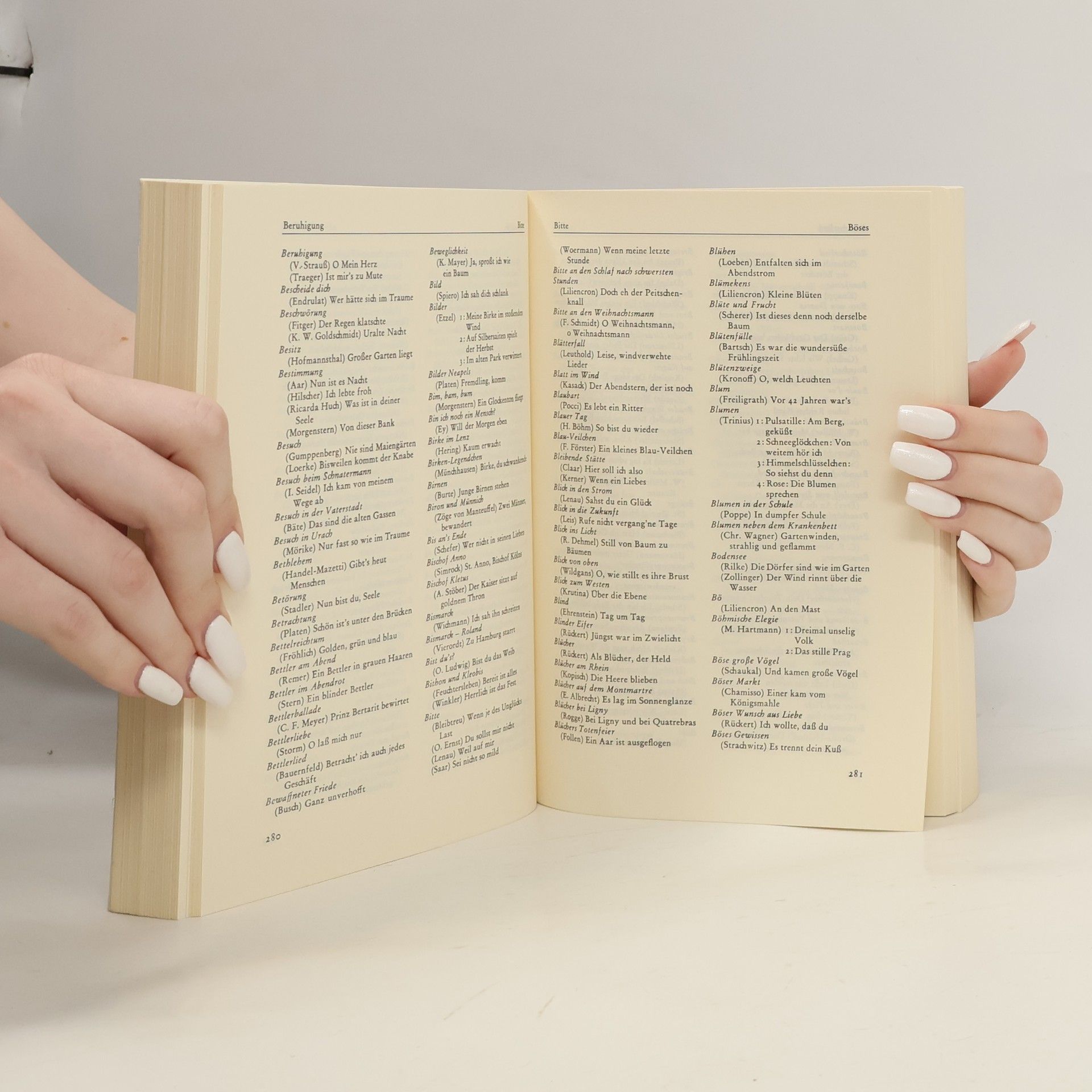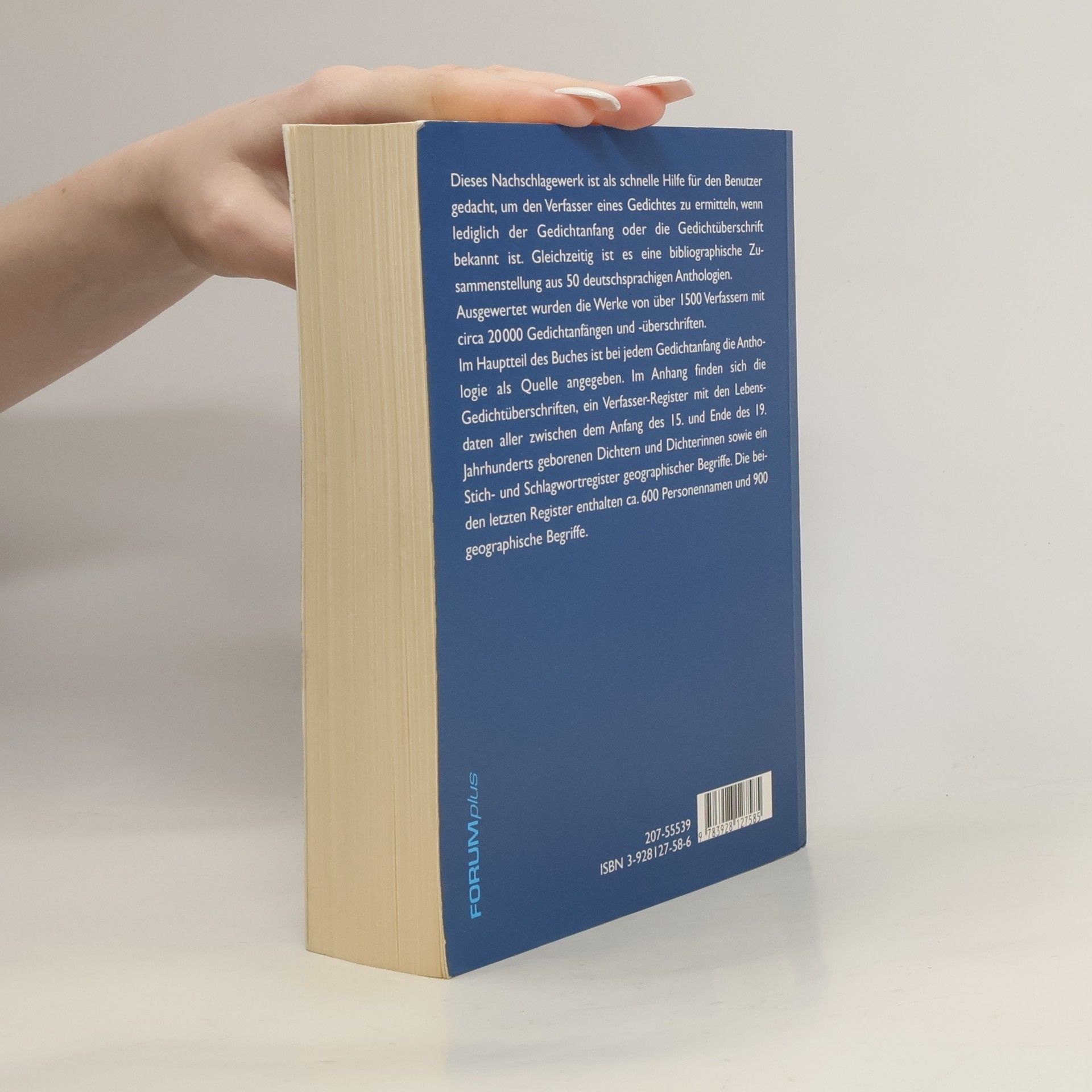Das seit vielen Jahren bewährte Nachschlagewerk hilft, den Verfasser eines gesuchten Gedichtes zu finden, von dem nur der Titel oder der Anfang bzw. ein historisches oder geographisches Stichwort enthalten ist. Insgesamt wurden die Werke von über 1.500 Dichtern und Dichterinnen, die vom 15. bis Ende des 19. Jahrhunderts geboren sind, mit annähernd 20.000 Gedichtanfängen und -überschriften erfasst. Außerdem enthält der Band ein Verfasser-Register, ein Register mit über 600 Personennamen und ein Register mit 900 geographischen Begriffen.