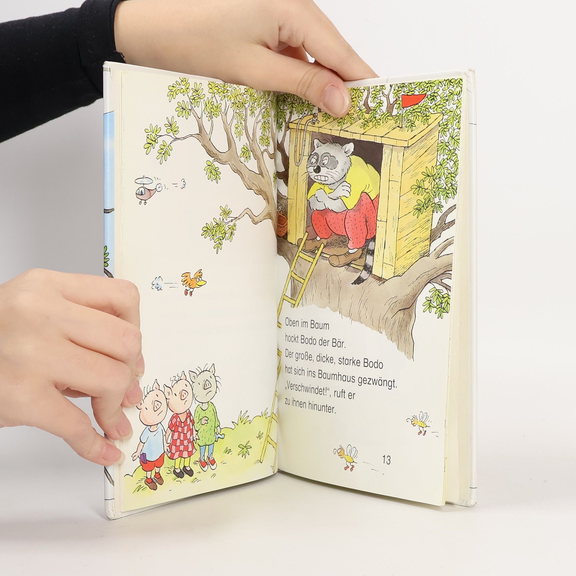 Karola, Fips und Eduard sind dicke Freunde. Natürlich sind sie nicht wirklich dick, aber sie wollen ewig Freunde bleiben. Vor einer Woche haben sie sich im Walnussbaum ein Baumhaus gebaut. Es ist sehr gemütlich und sie spielen jeden Tag darin. Aber als die drei heute in ihr Haus klettern wollen, machen sie große Augen. Das Baumhaus ist besetzt! Es wackelt und bricht fast auseinander, weil Bodo der Waschbär dort oben hockt. Der will die drei ein bisschen ärgern, aber das lassen sich die Freunde nicht gefallen. Sie wissen schon, wie sie Bodo wieder loswerden.