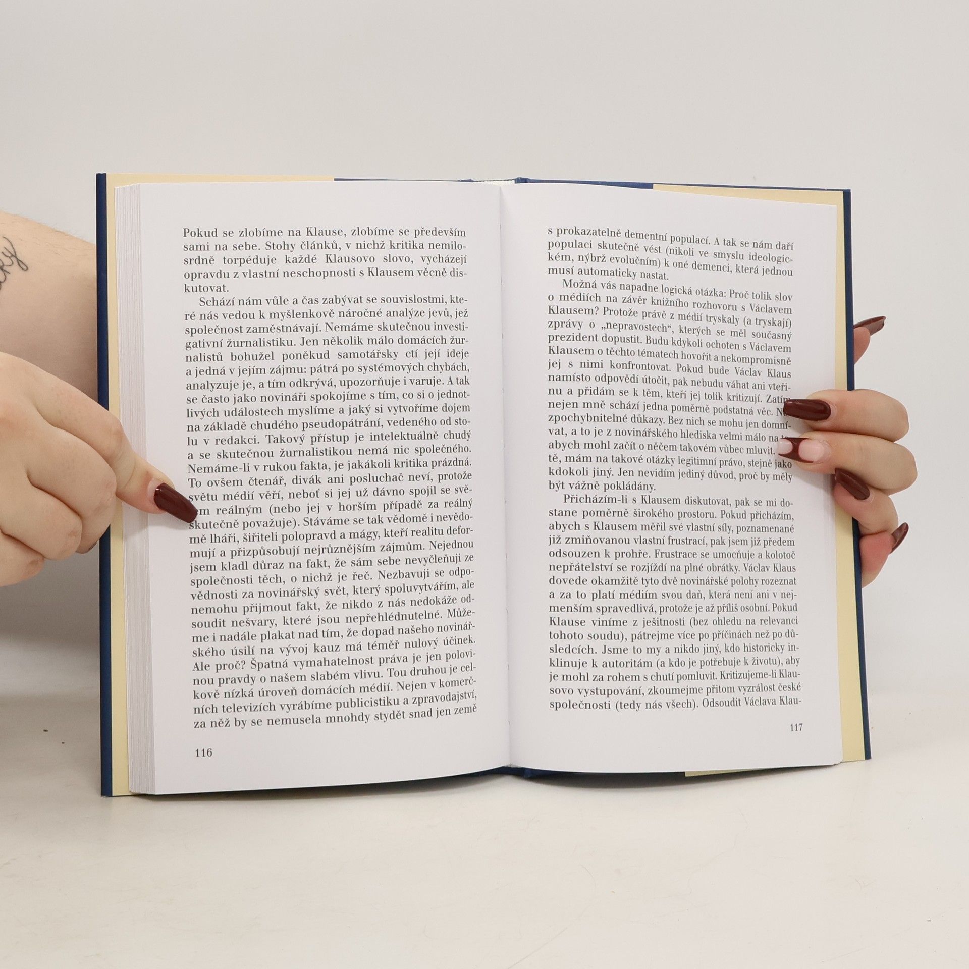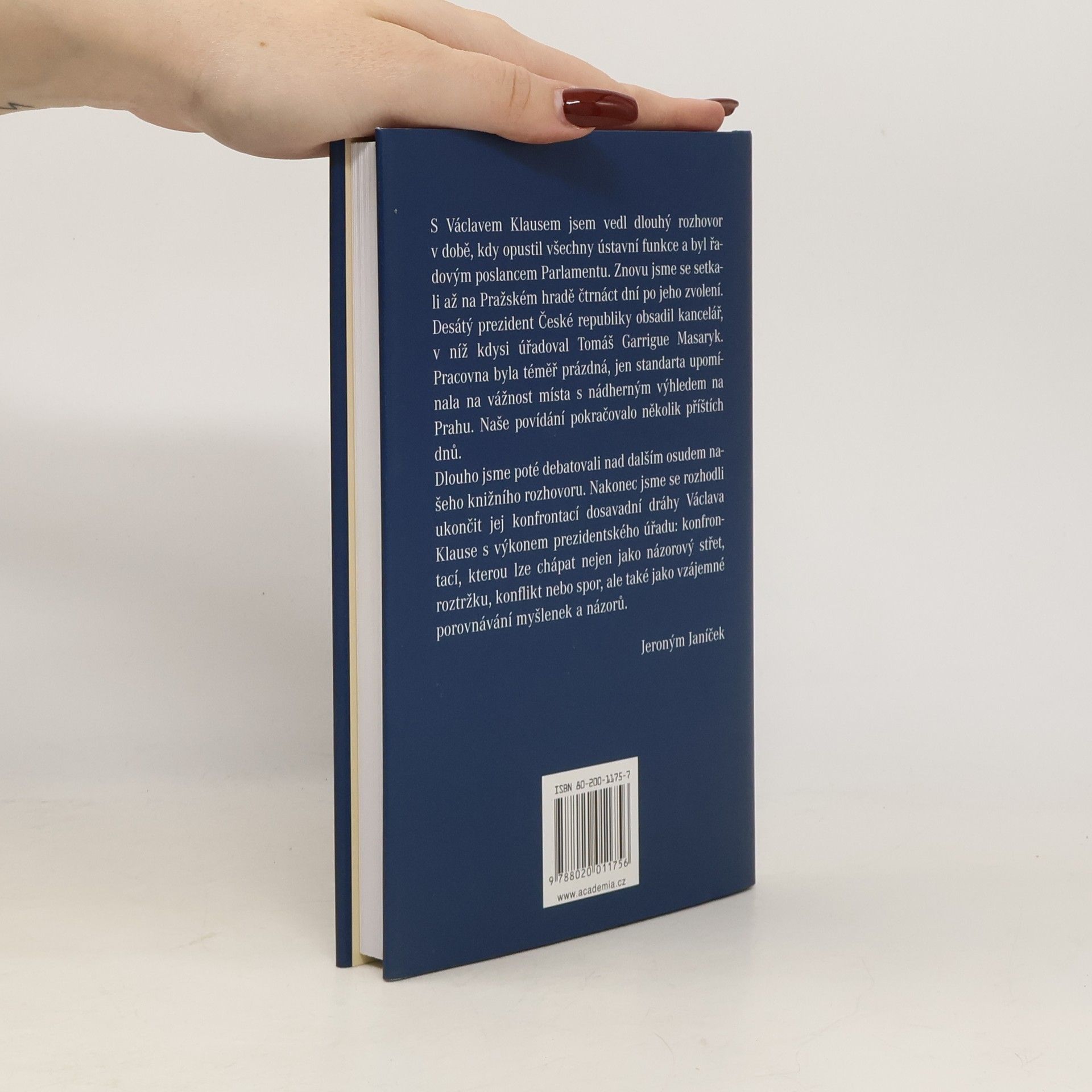 /Prezident Václav Klaus v diskusi s Jeronýmem Janíčkem/ Novinář Jeroným Janíček vedl dlouhý rozhovor s Václavem Klausem v době, kdy opustil všechny ústavní funkce a byl řadovým poslancem Parlamentu. Znovu se pak setkali na Pražském hradě po čtrnácti dnech od zvolení Klause prezidentem České republiky. Rozhovor se tak stal konfrontací dosavadní dráhy Václava Klause s výkonem prezidentského úřadu: konfrontací, kterou lze chápat nejen jako názorový střet, roztržku, konflikt nebo spor, ale také jako vzájemné porovnávání myšlenek a názorů.... celý text