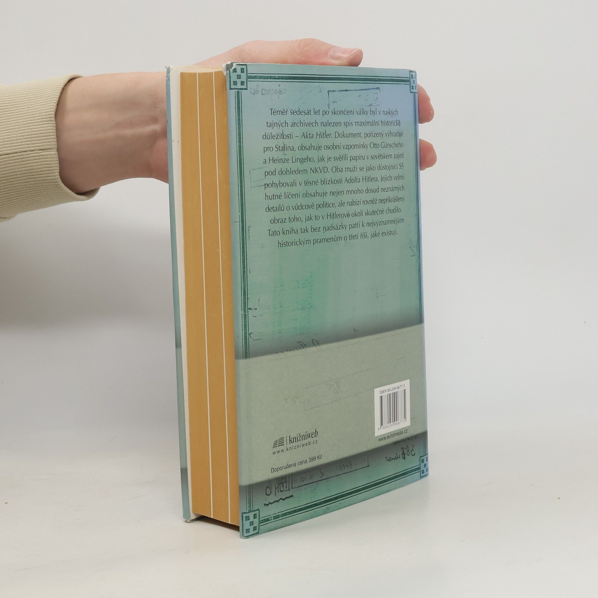 Téměř šedesát let po skončení války byl v ruských archivech nalezen spis maximální historické důležitosti: Akta Hitler. Dokument, pořízený výhradně pro Stalina, obsahuje osobní vzpomínky Otto Günscheho a Heinze Lingeho, jak je svěřili papíru v sovětském zajetí pod dohledem NKVD. Oba muži se jako důstojníci SS pohybovali v největší blízkosti Adolfa Hitlera. Jejich velmi hutné líčení obsahuje nejen mnoho dosud neznámých detailů o vůdcově politice, ale nabízí rovněž nepřikrášlený obraz toho, jak to v Hitlerově okolí skutečně chodilo. Akta Hitler tak bez nadsázky patří k nejvýznamnějším historickým pramenům o třetí říši, jaké existují.