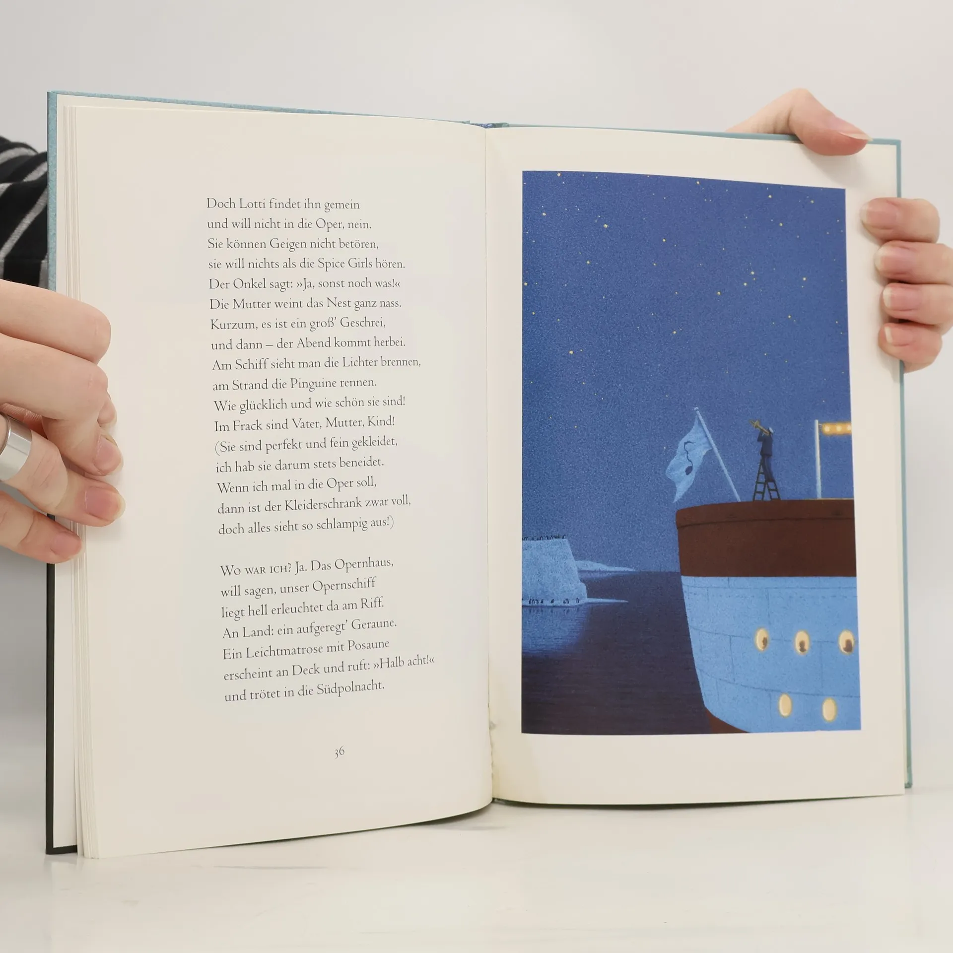 Am Südpol stehen sich die Pinguine die Beine in den Bauch. Geduldig harren sie der Dinge, die da kommen werden, und sie sind immer perfekt im Frack. Worauf sie warten? Elke Heidenreich hat es Gott sei Dank herausgefunden: Nicht allzu oft, doch dann und wann, kommt das Opernschiff aus Wien und lädt die Pinguine zur großen Operngala an Bord. Für diesen Tag wollen sie jederzeit gerüstet sein. Was diesmal wohl gespielt wird? Wer dieses Mal wohl singt? Man glaubt es kaum, die drei Tenöre. Und wenn sie »La Traviata« trällern, wird selbst den unterkühlten Pinguinen ganz heiß - aber auch nach der Vorstellung stehen sie so adrett da wie immer!