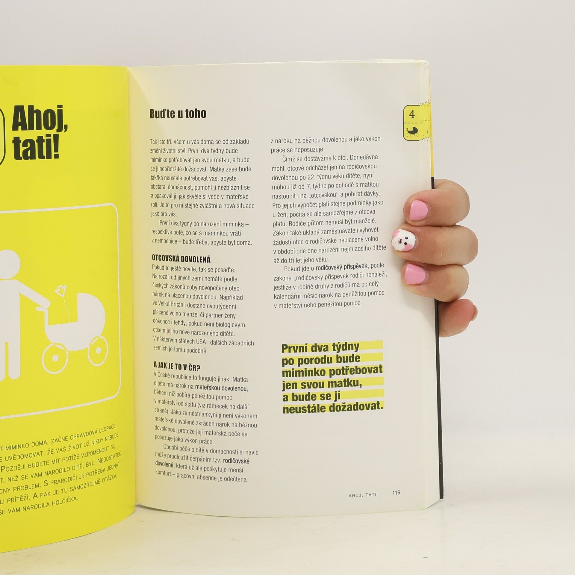 Praktická příručka pro nové tatínky (i ty nevlastní) Praktická příručka je určena aktivním otcům, kteří mají zájem pomáhat své ženě a plně se podílet na péči o své potomky. Knížka provází tatínky od rozhodnutí mít dítě, přes jeho početí, ženino těhotenství a porod až k péči o novorozeně a batole. Knížka přisuzuje otci náročnou a aktivní roli v péči o potomka i v péči o celou rodinu a domácnost. Velmi přehledně shrnuje praktické rady, jak nejlépe postupovat a čeho se naopak vyvarovat. Přehledný výklad doplňuje několik zábavných testů. Tři čtvrtiny knihy jsou věnovány péči o novorozeně a malé dítě. Poslední kapitoly trochu násilně zasvěcují otce do tajů puberty, manželské krize a rozvodu. V závěru doporučená literatura a rejstřík pojmů.