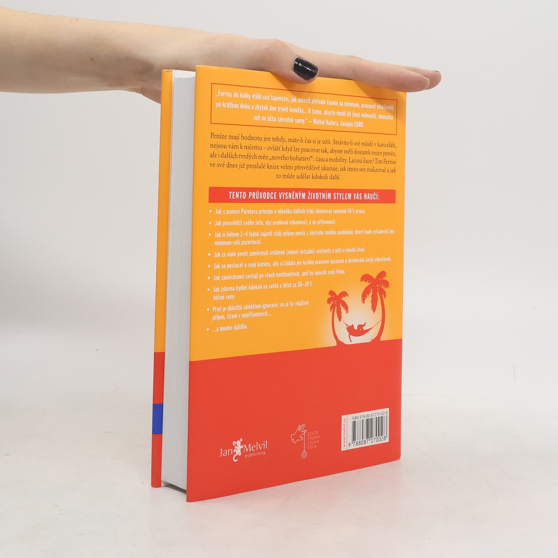 Peníze mají hodnotu jen tehdy, máte-li čas si je užít. Strávíte-li své mládí v kanceláři, nejsou vám k ničemu zvlášť když lze pracovat tak, abyste měli dostatek nejen peněz, ale i dalších tvrdých měn nového bohatství: času a mobility. Laciná iluze? Tim Ferriss ve své dnes již proslulé knize velmi přesvědčivě ukazuje, jak tento sen realizoval a jak to může udělat kdokoli další. Kniha je světovým bestsellerem a vyšla v 35 zemích.