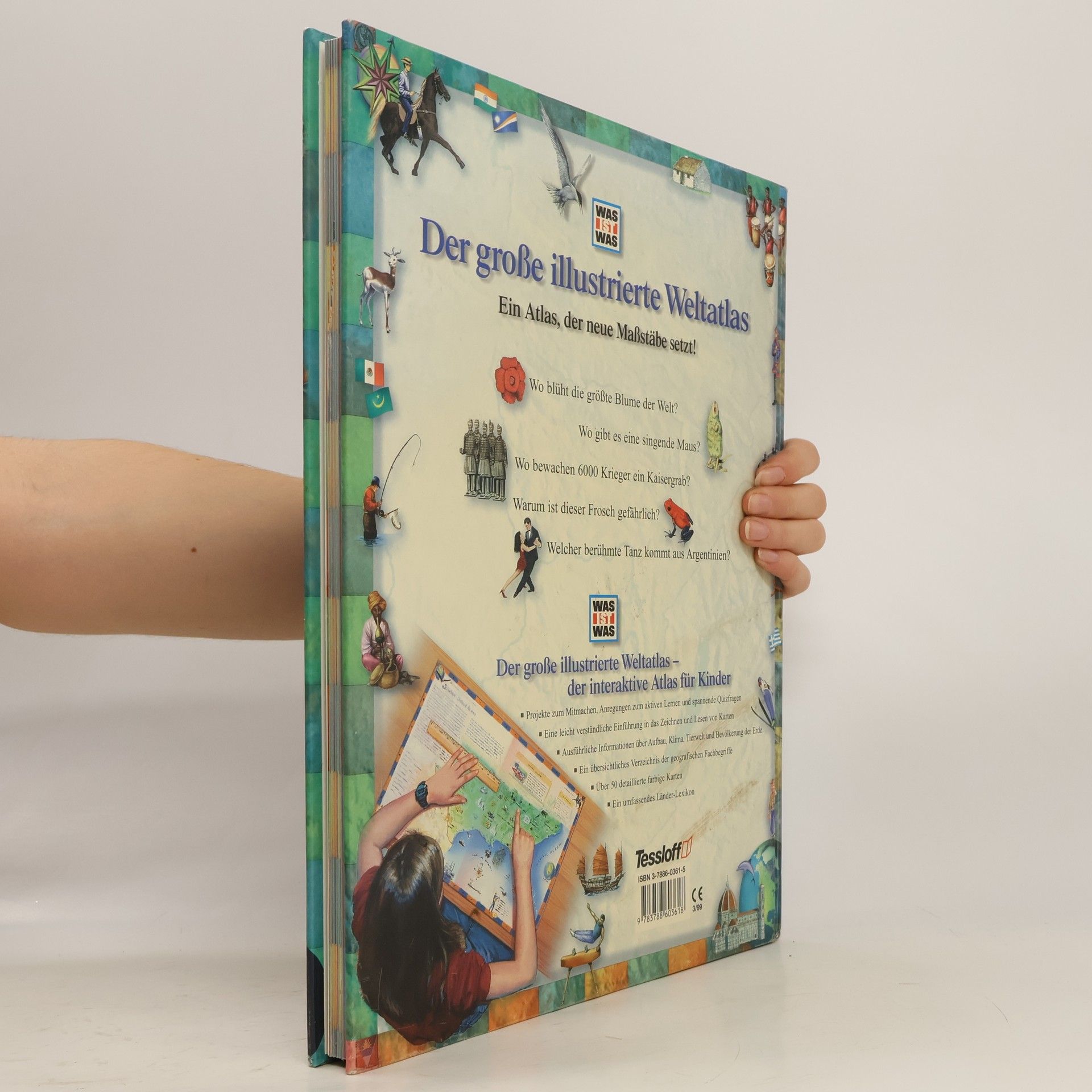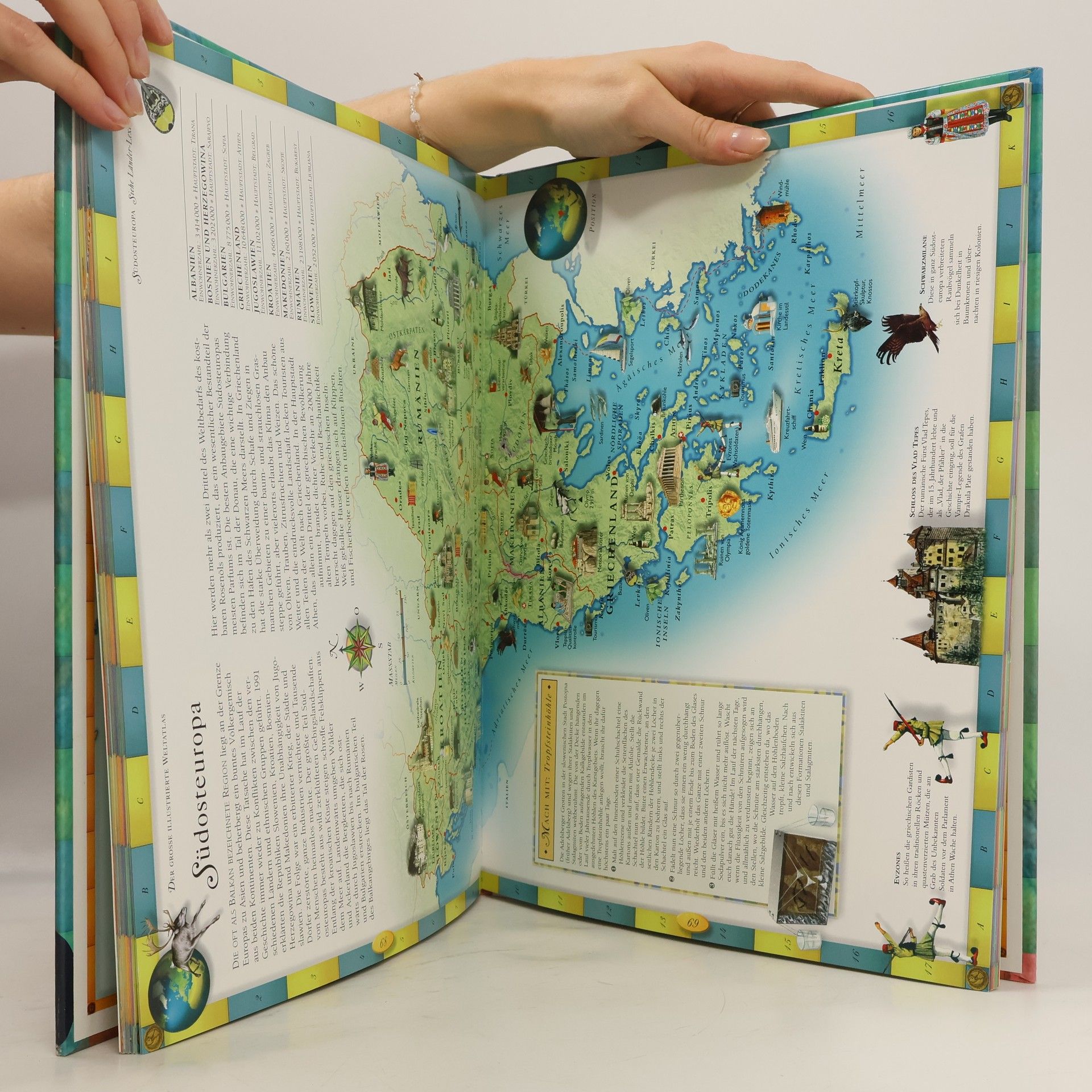 „Ein prachtvoll ausgestatteter Atlas; alle Länder der Erde sind in aufwendig illustrierten geographischen Karten dargestellt, die Besonderheiten jedes Landes und Kontinents zeigen. Außerdem gibt es Anleitungen zum Basteln landestypischer Gegenstände, Anregungen für Experimente sowie Quiz- und Rätselfragen.“