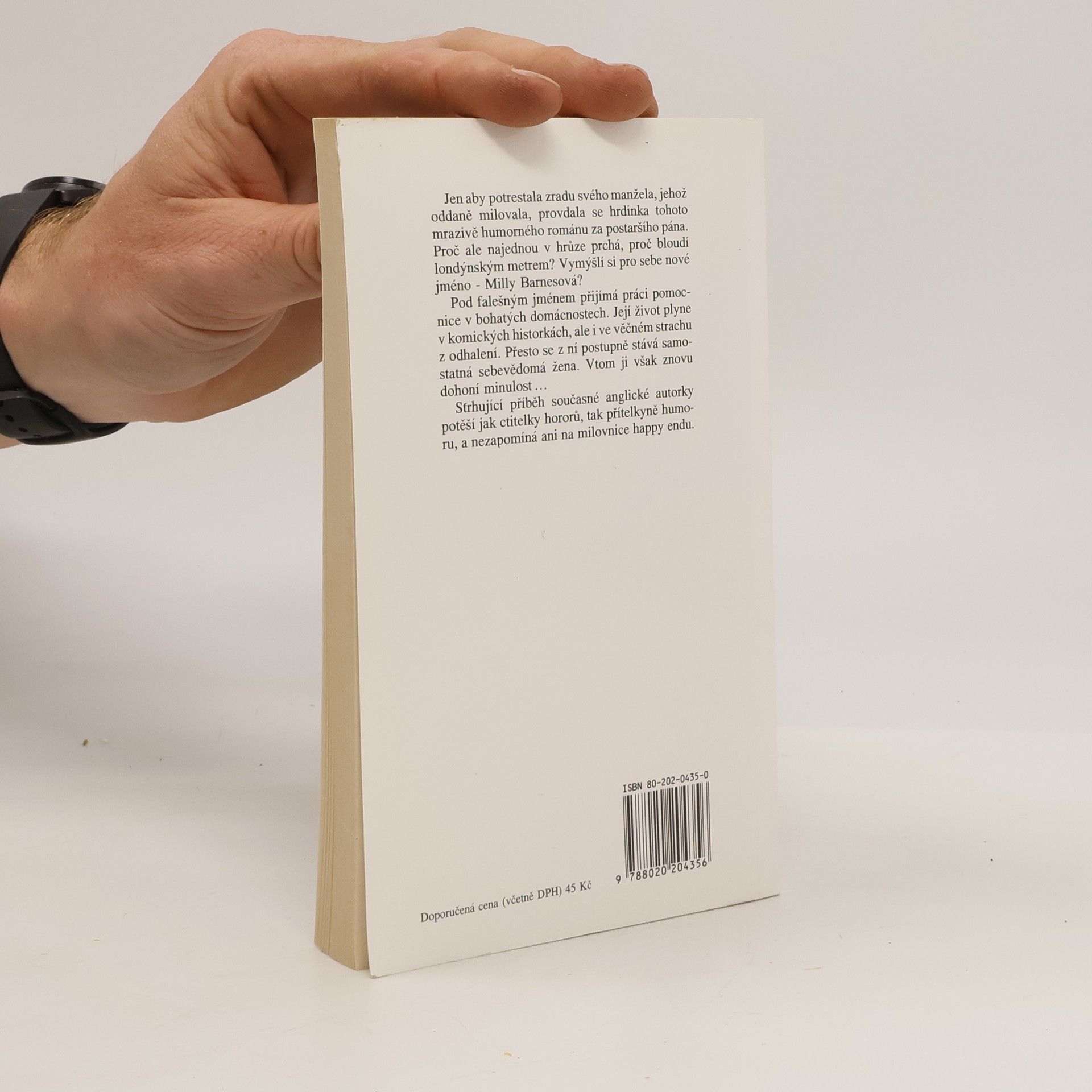 Jen aby potrestala zradu svého manžela, jehož oddaně milovala, provdala se hrdinka tohoto mrazivě humorného románu za postaršího pána. Proč ale najednou v hrůze prchá, proč bloudí londýnským metrem? Vymýšlí si pro sebe nové jméno - Milly Barnesová? Pod falešným jménem přijímá práci pomocnice v bohatých domácnostech.Její život plyne v komických historkách, ale i ve věčném strachu z odhalení. Přesto se z ní postupně stává sebevědomá žena. Vtom ji však znovu dohoní minulost... Strhující příběh anglické autorky potěší jak ctitelky hororů, tak přítelkyně humoru, a nezapomíná ani na milovnice happy endu.
