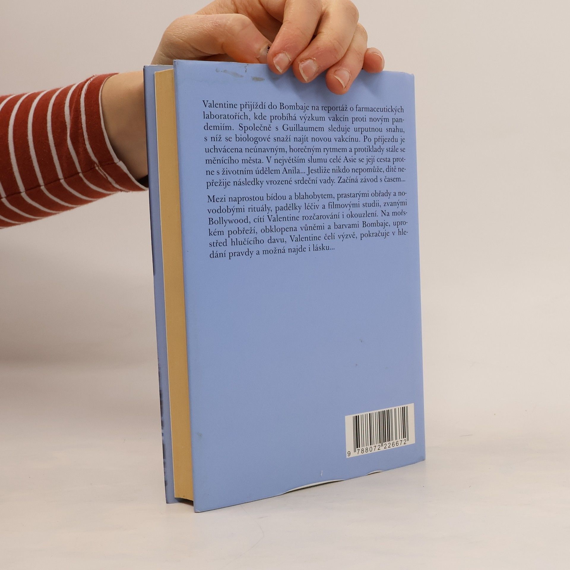 Podtitul: román Valentine přijíždí do Bombaje na reportáž o farmaceutických laboratořích, kde probíhá výzkum vakcín proti novým pandemiím. Společně s Guillaumem sleduje urputnou snahu, s níž se biologové snaží najít novou vakcínu. Po příjezdu je uchvácena neúnavným, horečným rytmem a protiklady stále se měnícího města. V největším slumu celé Asie se její cesta protne s životním údělem Anila… Jestliže nikdo nepomůže, dítě nepřežije následky vrozené srdeční vady. Začíná závod s časem… Mezi naprostou bídou a blahobytem, prastarými obřady a novodobými rituály, padělky léčiv a filmovými studii, zvanými Bollywood, cítí Valentine rozčarování i okouzlení. Na mořském pobřeží, obklopena vůněmi a barvami Bombaje, uprostřed hlučícího davu, Valentine čelí výzvě, pokračuje v hledání pravdy a možná najde i lásku…