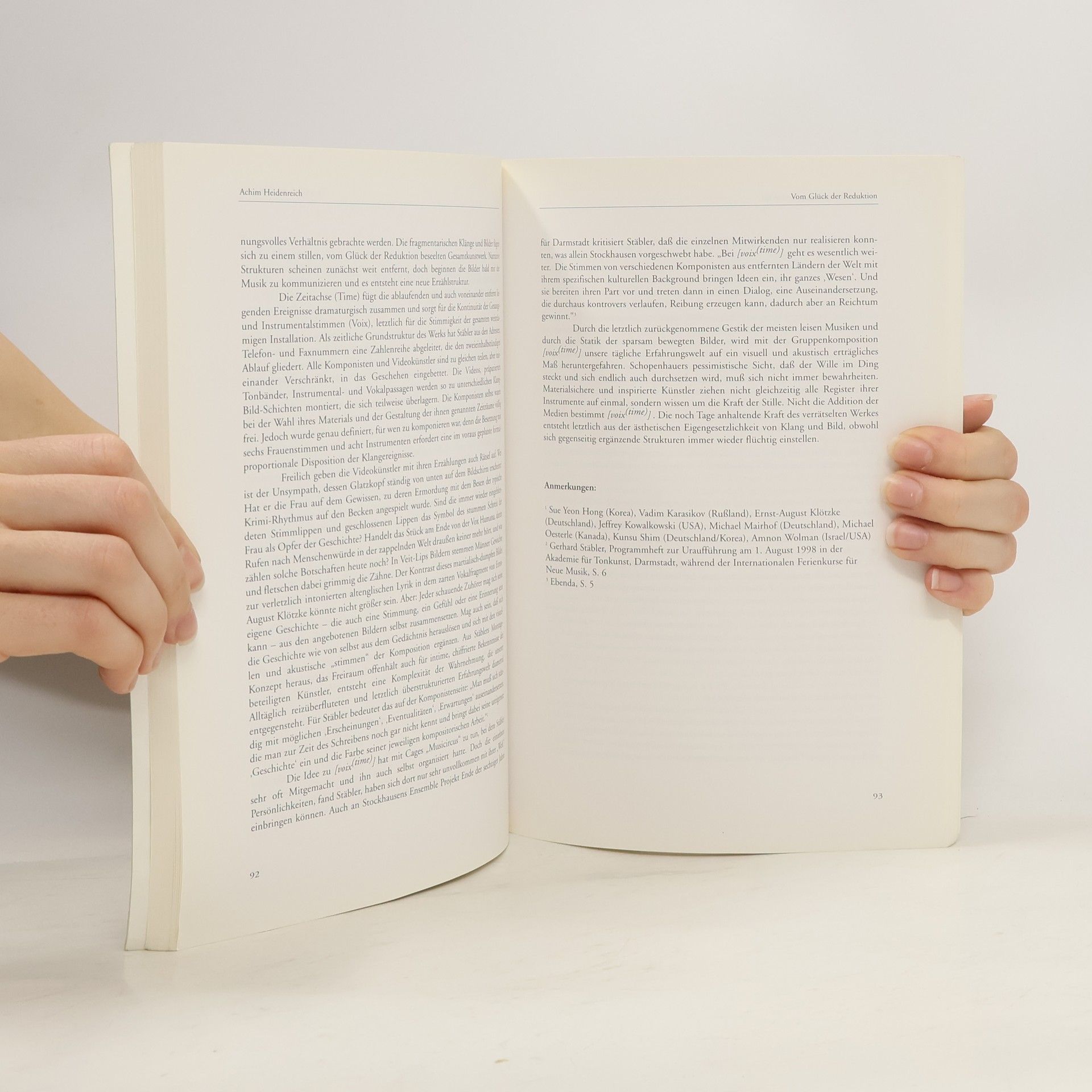 Ganz allgemein gesprochen setzt Musik, die unter den geläufigen konzertanten Umständen aufgeführt wird, einen Raum mehr voraus, als dass sie ihn sich selber schafft. Konzerträume, analoge wie etwa Philharmonien oder digitale wie CDs, das sind in jedem Fall hochtechnologisierte ideale Gehäuse, die, wenn sie Musik „einräumen“, ihr bestenfalls Platz lassen für die Abrufung einer imaginären ästhetischen Arbeit sowie einer kultivierten Vergangenheit.
