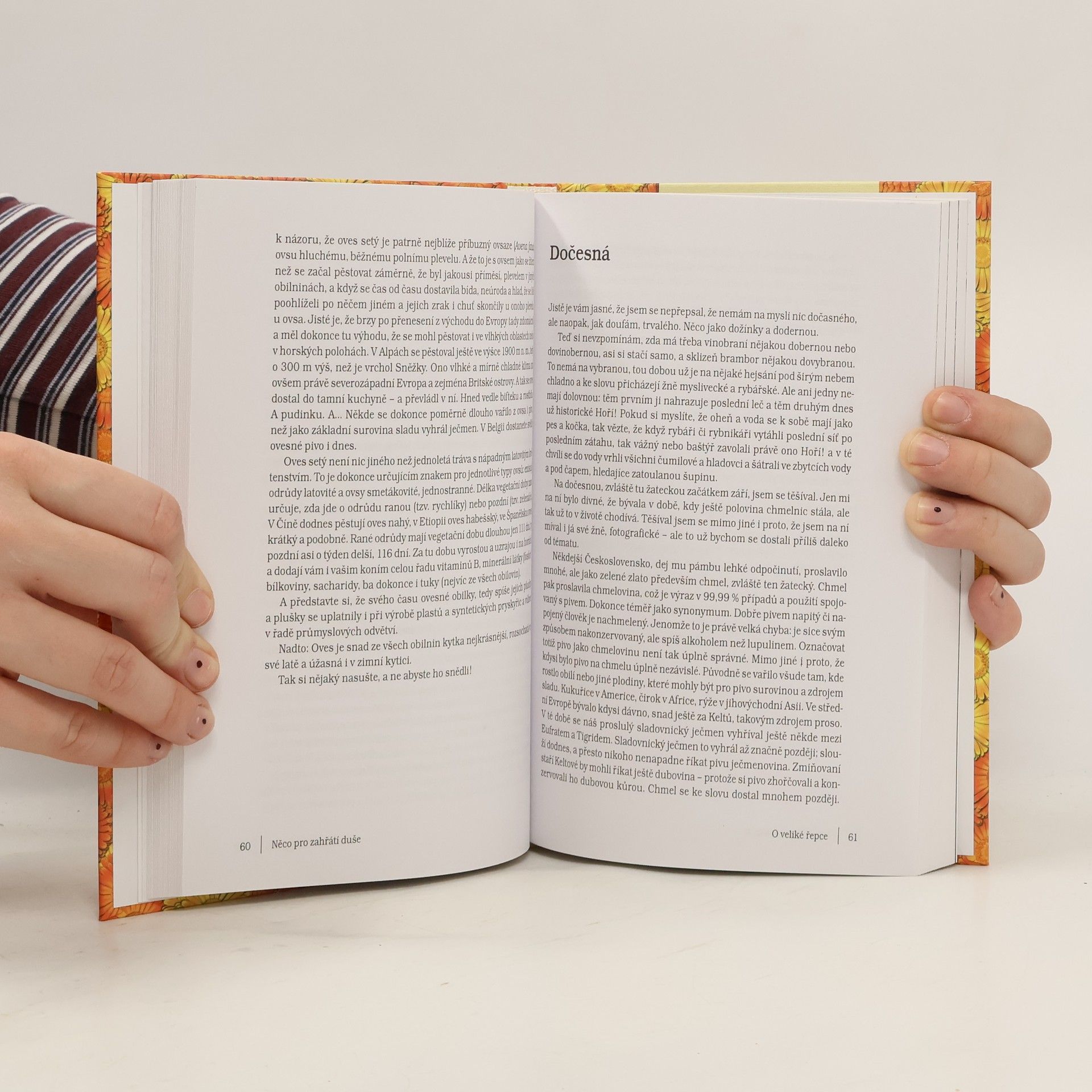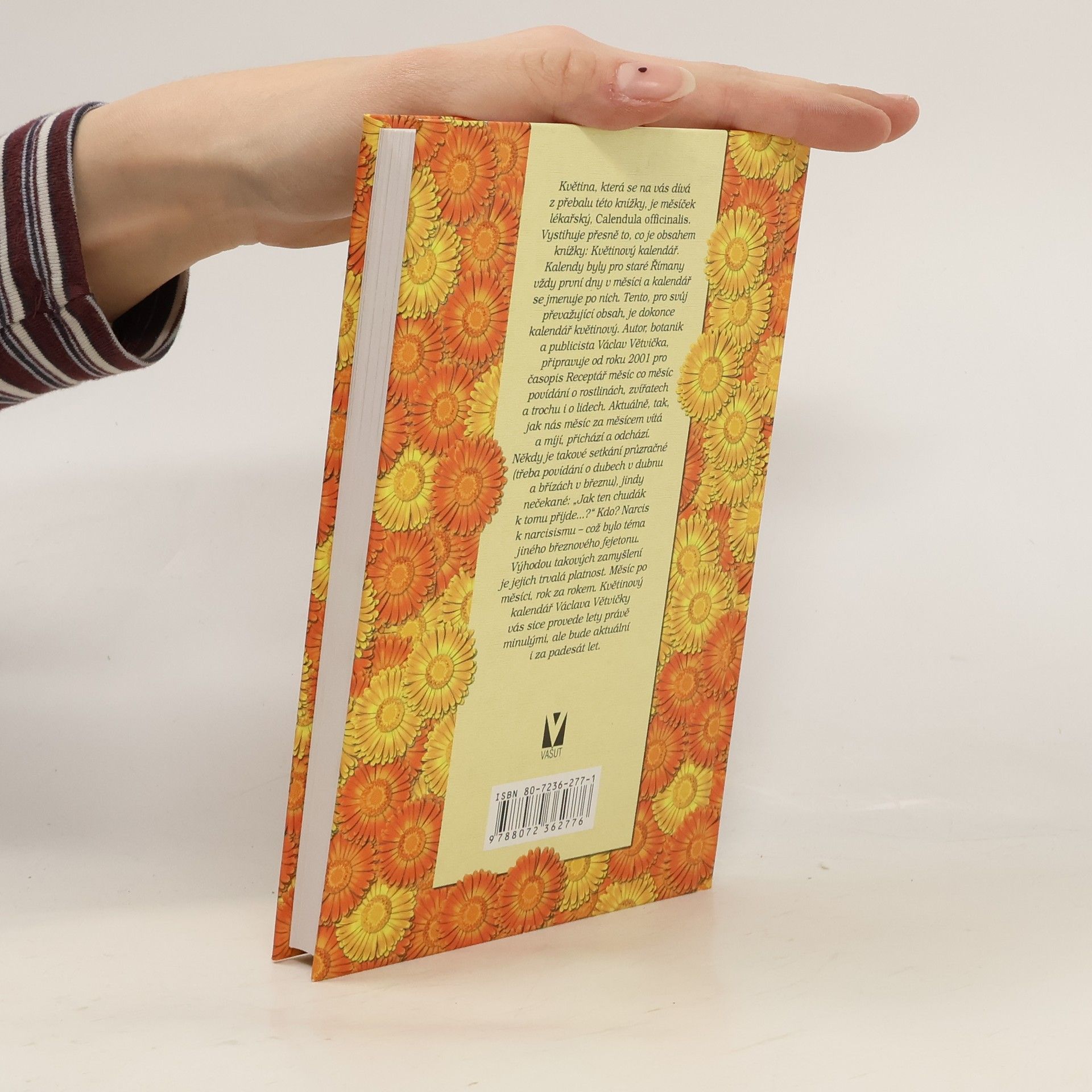 Květina, která se na vás dívá z přebalu této knížky je měsíček lékařský, "Calendula officinalis". Aniž se jakkoliv domlouvali autor, nakladatel a výtvarník, vystihuje přesně to, co je obsahem knížky: Květinový kalendář. Autor, botanik a publicista Václav Větvička připravuje od roku 2001 pro časopis Receptář měsíc co měsíc povídání o rostlinách, zvířatech a trochu i o lidech. Někdy je takové setkání průzračné (třeba povídání o dubech v dubnu a břízách v březnu), jindy nečekané: "Jak ten chudák k tomu přijde...?" Kdo? Narcis k narcisismu - což bylo téma jiného březnového fejetonu.