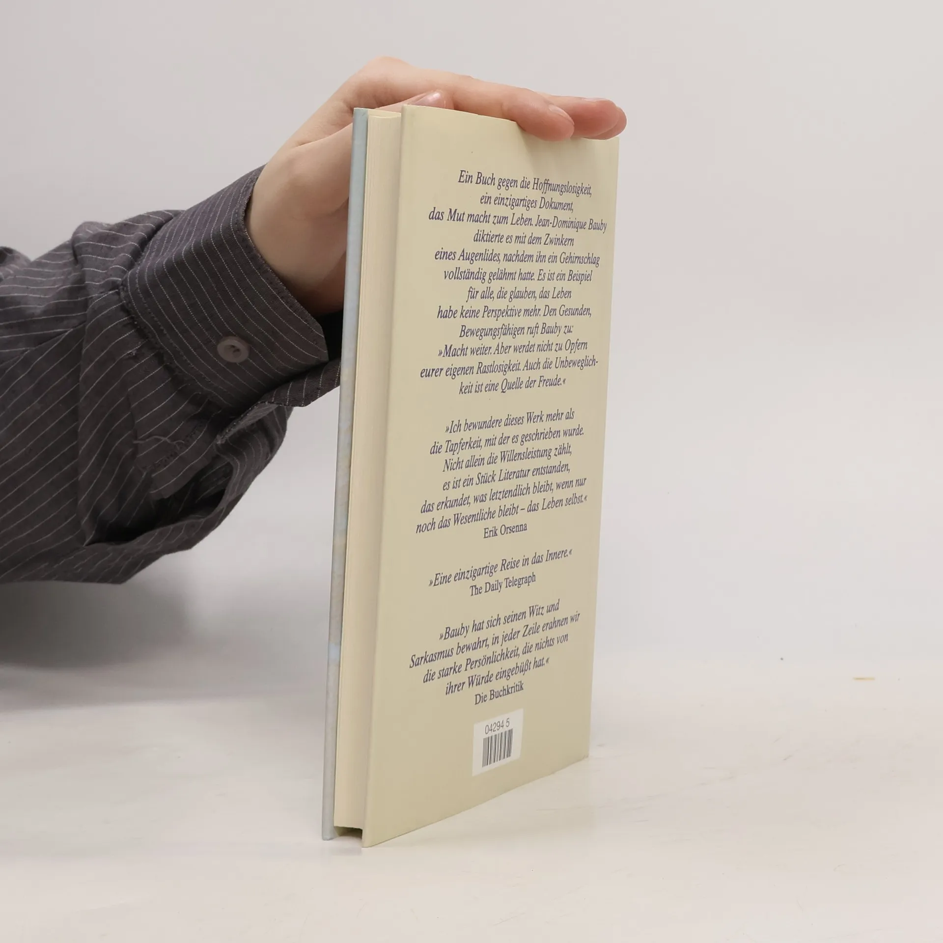 Ein Akt der Selbstbehauptung angesichts der totalen physischen Niederlage. Ein erschütterndes Selbstzeugnis, ein einzigartiges Stück Literatur und ein Buch, das Mut macht zum Leben. Er war 43 Jahre alt, Vater zweier Kinder und erfolgreicher Redakteur, als ihn am 8.12.1995 ein Gehirnschlag all seiner bisherigen Lebensmöglichkeiten beraubte. Von diesem Tag an blieb er vollständig gelähmt, unfähig zu sprechen, zu schlucken oder auch nur ein Glied zu rühren, und die einzige Möglichkeit, sich verständlich zu machen, war das Blinzeln mit einem Auge. Fünfzehn Monate später beendete er ein Buch, das er allein mit dem linken Augenlid diktiert hatte. Ein einzigartiges Dokument: zum ersten Mal berichtet ein Opfer des Locked-in-Syndroms, was in einem Menschen vorgeht, der äußerlich zur Statue erstarrt, doch innerlich quicklebendig geblieben ist. Bauby selbst hat die Hoffnung nie aufgegeben. Die Krankheit hat ihn zu einem Schriftsteller gemacht, der nicht nur mit bewundernswertem Humor seine Situation analysiert, sondern Phantasie und das Schreiben als das beste Gegenmittel begreift.