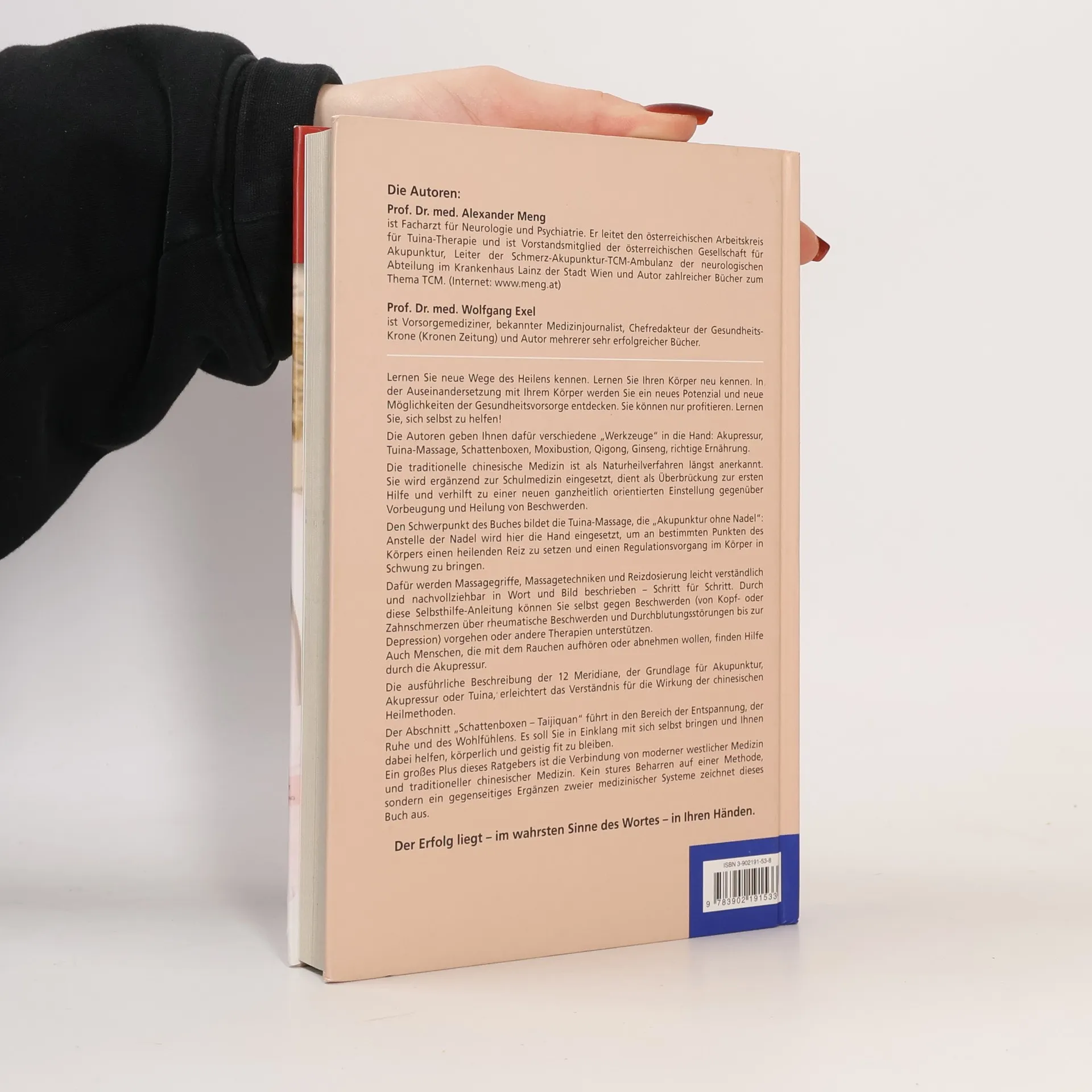 Lernen Sie neue Wege des Heilens kennen. Lernen Sie Ihren Körper neu kennen. In der Auseinandersetzung mit Ihrem Körper werden Sie ein neues Potenzial und neue Möglichkeiten der Gesundheitsvorsorge entdecken. Sie können nur profitieren. Lernen Sie, sich selbst zu helfen!Die Autoren geben Ihnen dafür verschiedene "Werkzeuge" in die Hand: Akupressur, Tuina-Massage, Schattenboxen, Moxibustion, Qigong, Ginseng, richtige Ernährung.