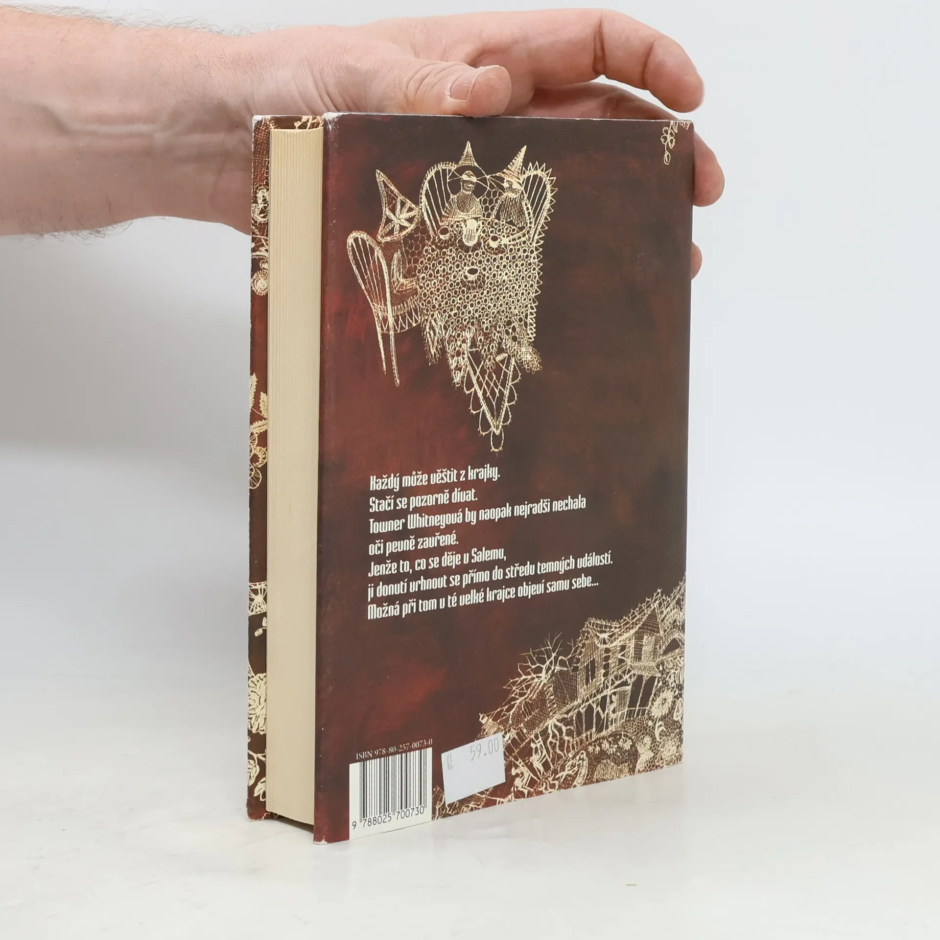 Strhující a překvapivě vypointovaný román o novodobém honu na čarodějnice. Towner Whitneyová se narodila v americkém městě Salem, které neblaze proslulo čarodějnickými procesy v 17. století. Na konci 20. století by se mohlo zdát, že doba slepých vášní a hořících hranic je dávno pryč. Jenže není… Towner je z rodu Whitneyů a ovládá magickou schopnost věštit z krajky. Když se dozví, že zmizela její milovaná prateta Eva, musí překonat sama sebe, vrátit se do Salemu a napřít všechny síly k tomu, aby odhalila, co se vlastně stalo. Jak zjistí ona i čtenáři, tajemství dlí hlouběji, než by kdokoliv čekal, a při jeho odhalování půjde o všechno. Nevšední a dramatický příběh ze současnosti je pro čtenáře stejně uhrančivý, jako je pro ženy z rodu Whitneyů pohled do spletitého vzoru salemské krajky. Autorka románu Brunonia Barryová sklidila se svou prvotinou bouřlivé ovace amerického čtenářského publika.