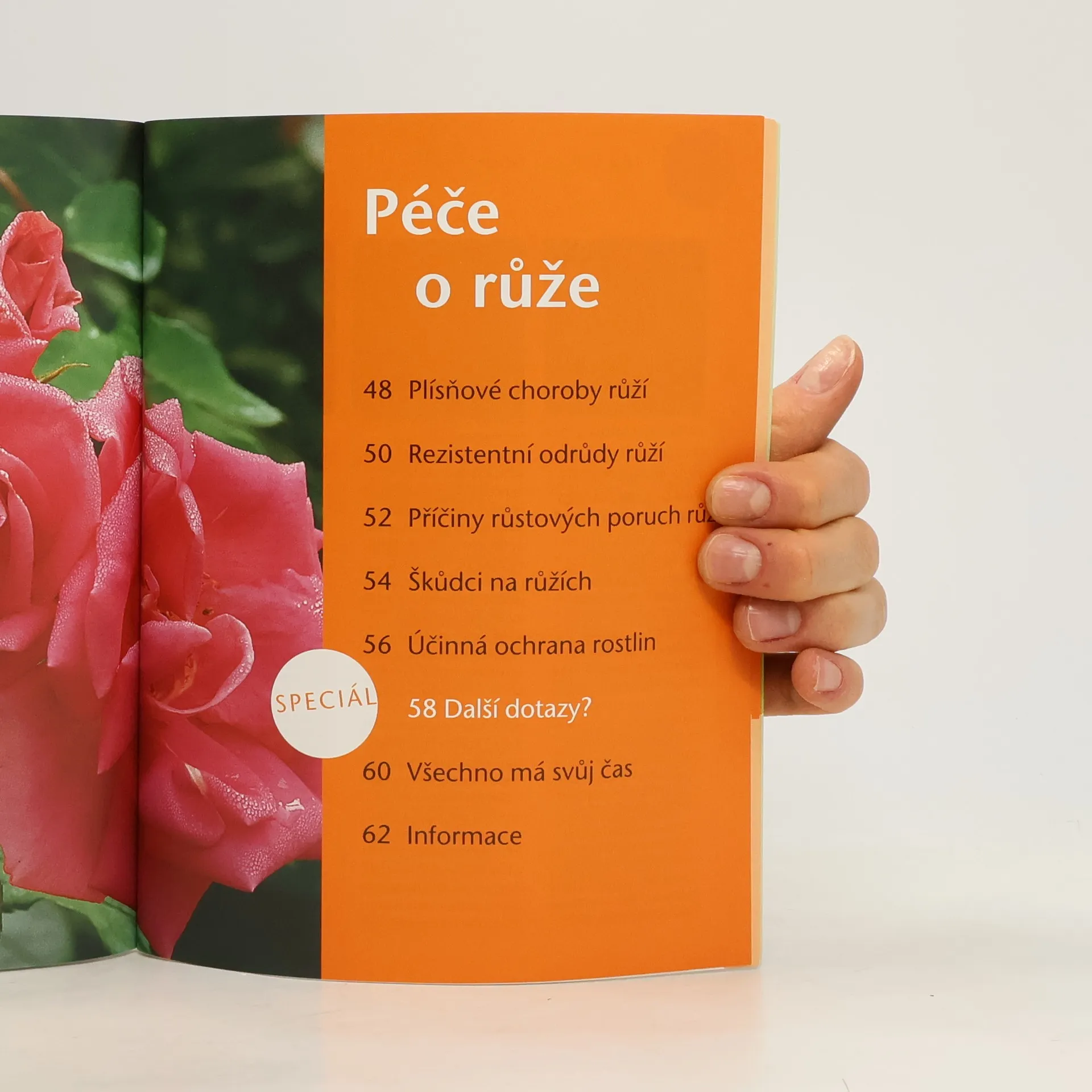 Péče o růže jednoduše, ale správně · Základní informace: skupiny růží, tvary růstu, nároky na stanoviště, možnosti uplatnění · Kurz řezu: jarní a letní řez jednou do roka kvetoucích i remontujících růží, zmlazovací řez · Péče o růže: rozpoznání nejčastějších chorob a jejich ošetření · Názorné obrázky pro správnou výsadbu a řez · Popis nejhodnotnějších odrůd, nápady pro výtvarné použití a výsadbu · „Horké téma“: jak můžete sami úspěšně množit růže Pro zájemce o pěstování růží, milovníky květin a zahrádkáře.