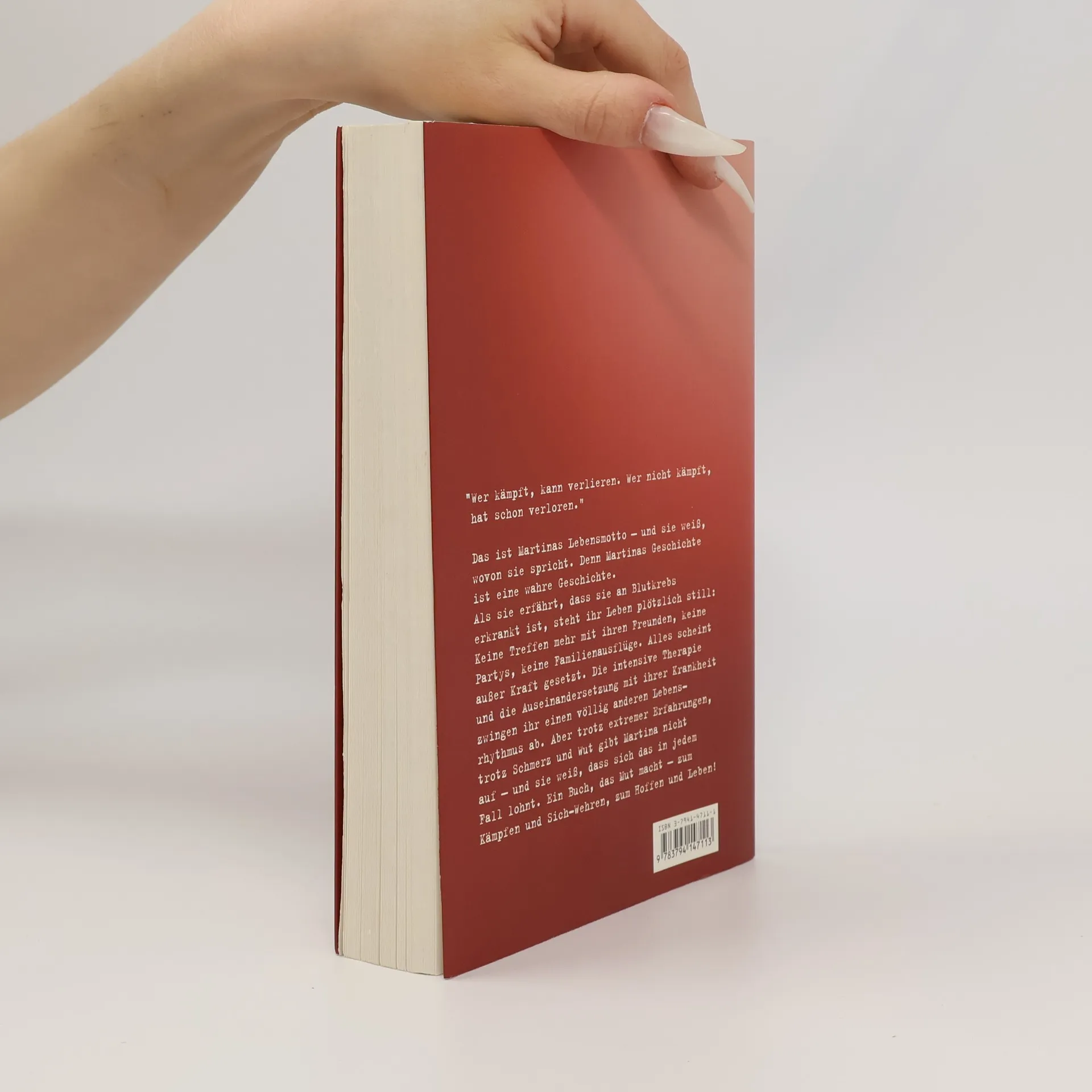 "Wer kämpft, kann verlieren. Wer nicht kämpft, hat schon verloren."§§Das ist Martinas Lebensmotto - und sie weiß, wovon sie spricht. Denn Martinas Geschichte ist eine wahre Geschichte.§Als sie erfährt, dass sie an Blutkrebs erkrankt ist, steht ihr Leben plötzlich still: Keine Treffen mehr mit Freunden, keine Partys, keine Familienausflüge. Alles scheint außer Kraft gesetzt. Die intensive Therapie und die Auseinandersetzung mit ihrer Krankheit zwingen ihr einen völlig anderen Lebensrythmus auf. Aber trotz extremer Erfahrungen, trotz Schmerz und Wut gibt Martina nicht auf - und sie weiß, dass sich das in jedem Fall lohnt. Ein Buch, das Mut macht - zum Kämpfen und Sich-Wehren, zum Hoffen und Leben.