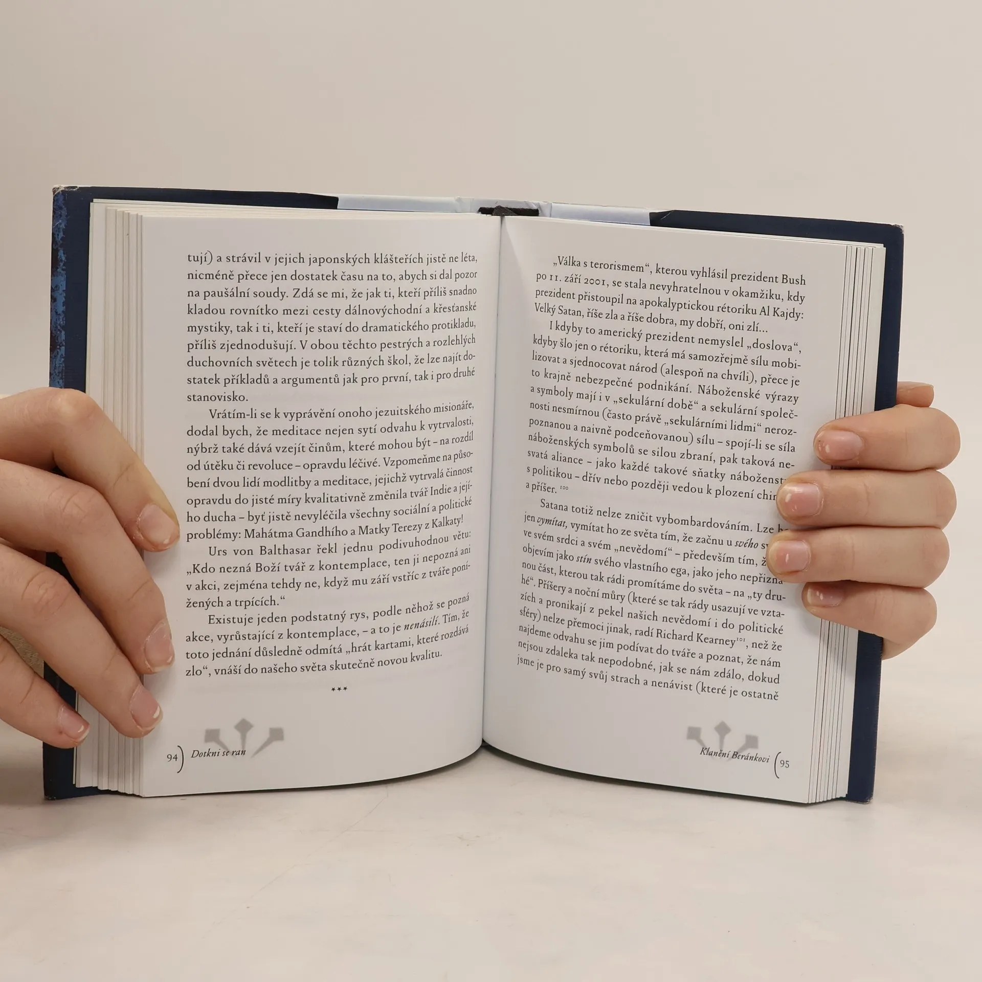 Ve čtrnácti esejích autor vychází z evangelijního příběhu o „nevěřícím Tomášovi". Představy o Bohu, církvi a víře „bez zranění" autor považuje za iluze. Ke křesťanské víře patří odvaha vidět rány našeho světa a dotýkat se jich vírou, která sama je jimi zasažena, zraněna. Tváří v tvář „zraněnému Bohu" člověk může odložit „brnění, masky a šminky", jimiž před druhými a někdy sám před sebou zakrývá svá bolestná místa. Kniha obsahuje jak teologicko-filozofické meditace, dotýkající se mystických hloubek víry, tak překvapivé, ostré i místy humorné komentáře konkrétních událostí a typických znaků naší doby. Zdrojem autorovy inspirace je křesťanská i židovská mystika, Pavlova a Lutherova teologie kříže, současná postmoderní filozofie a teologie i poklady staré lidové velikonoční zbožnosti a umění a v neposlední řadě i autorovy vlastní zkušenosti z dlouholeté terapeutické i pastorační praxe.