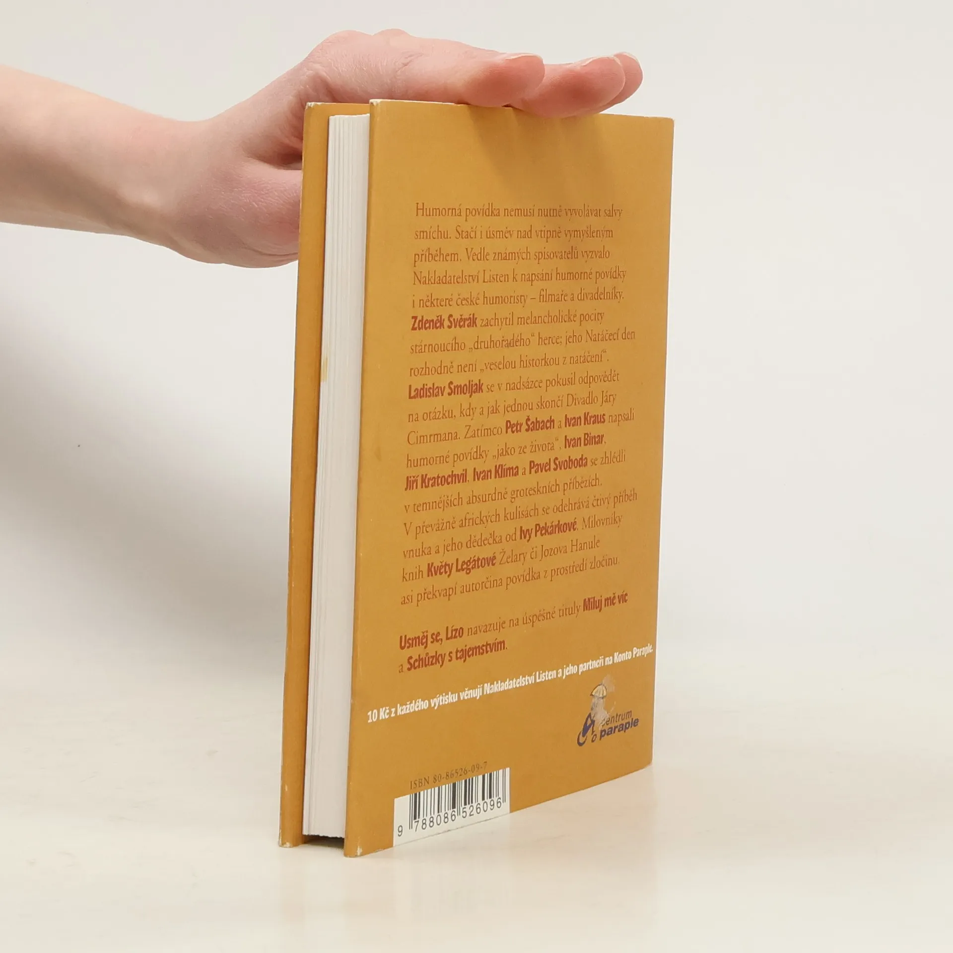 Humorná povídka nemusí nutně vyvolat salvy smíchu. Stačí i úsměv nad vtipně vymyšleným příběhem. Vedle známých spisovatelů vyzvalo nakladatelství Listen k napsání humorné povídky i některé české humoristy - filmaře a divadelníky. Zdeněk Svěrák zachytil melancholické pocity stárnoucího "druhořadého" herce; jeho Natáčecí den rozhodně není "veselou příhodou z natáčení". Ladislav Smoljak se v nadsázce pokusil odpovědět na otázku, kdy a jak jednou skončí Divadlo Járy Cimrmana. Zatímco Petr Šabach a Ivan Kraus napsali humorné povídky "jako ze života", Ivan Binar, Jiří Kratochvíl, Ivan Klíma a Pavel Svoboda se zhlédli v temnějších absurdně groteskních příbězích. V převážně afrických kulisách se odehrává čtivý příběh vnuka a jeho dědečka od Ivy Pekárkové. Milovníky knih Květy Legátové asi překvapí autorčina povídka z prostředí zločinu. Usměj se, Lízo navazuje na knihy Miluj mě víc a Schůzky s tajemstvím.... celý text