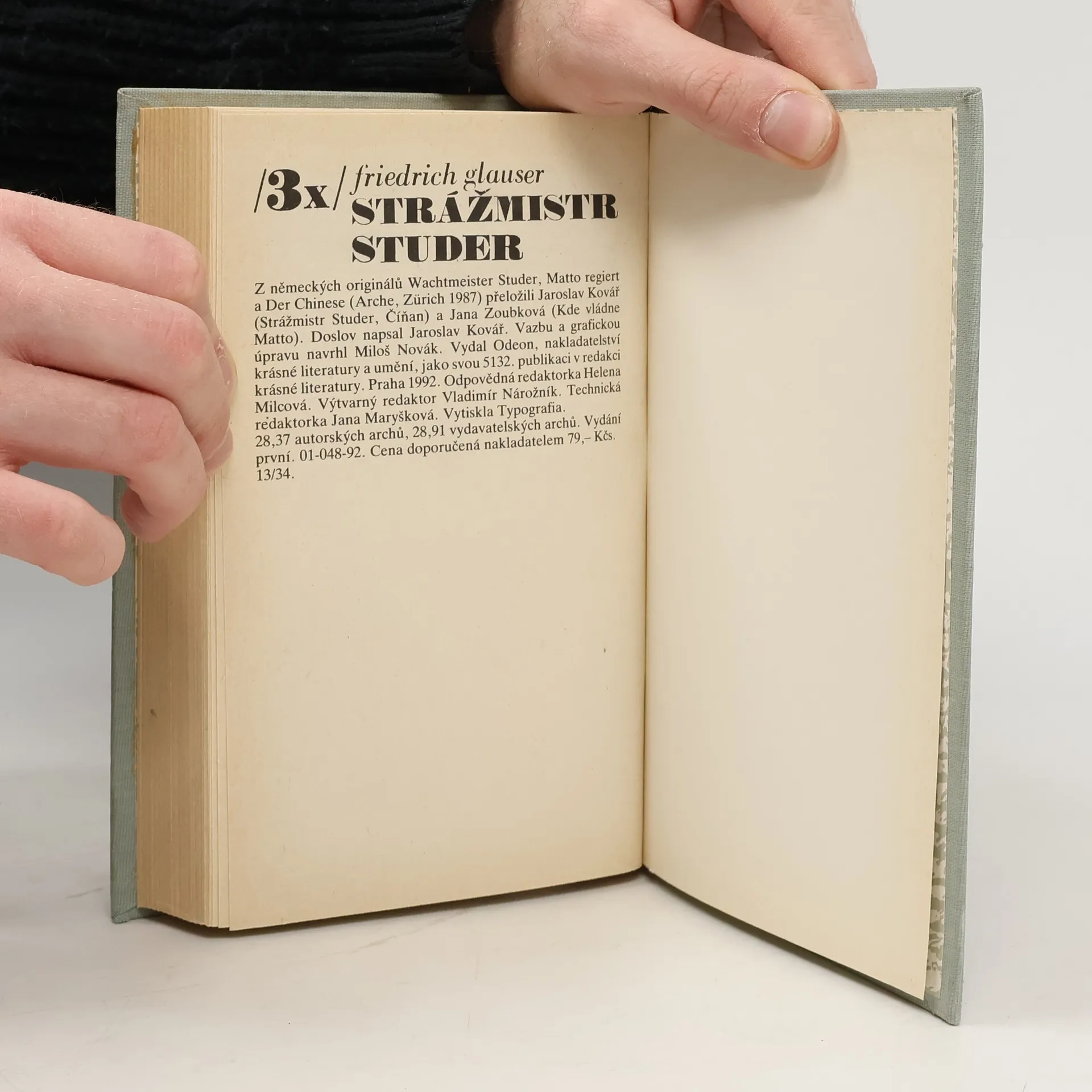 Kniha obsahuje tři příběhy: 1. Strážmistr Studer - přeložil Jaroslav Kovář. 2. Kde vládne Matto - přeložila Jana Zoubková. 3. Číňan - přeložil Jaroslav Kovář. Doslov : „Friedrich Glauser - švýcarský Simenon?“ napsal Jaroslav Kovář. Vydání první.