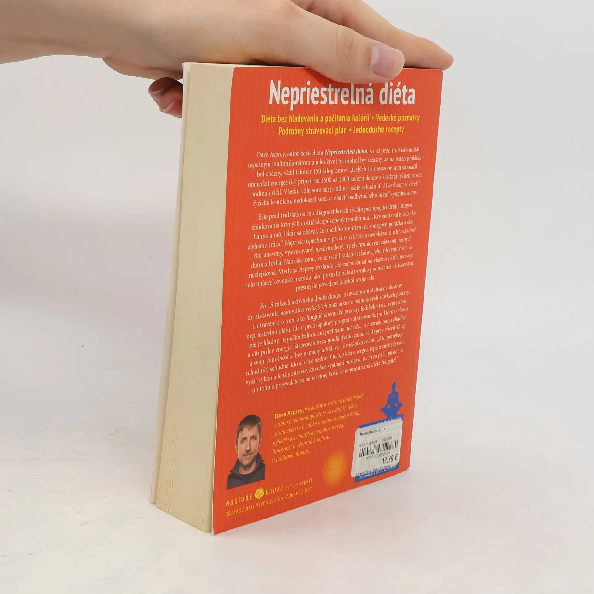 Dave Asprey, autor bestsellera Nepriestrelná diéta, sa už pred tridsiatkou stal úspešným multimilionárom a jeho život by mohol byť úžasný, až na jeden problém – bol obézny, vážil takmer 150 kilogramov! Na rok a pol drasticky obmedzil jedlo a každý deň cvičil. Aj keď si zlepšil fyzickú kondíciu, nedokázal sa zbaviť nadbytočného tuku a ešte pred tridsiatkou mu diagnostikovali vážne ochorenia. Vtedy sa Asprey rozhodol, že začne konať na vlastnú päsť a na svoje telo uplatní rovnakú metódu, akú poznal z oblasti svojho podnikania - hackerstvo; presnejšie povedané „hackol“ svoje telo.