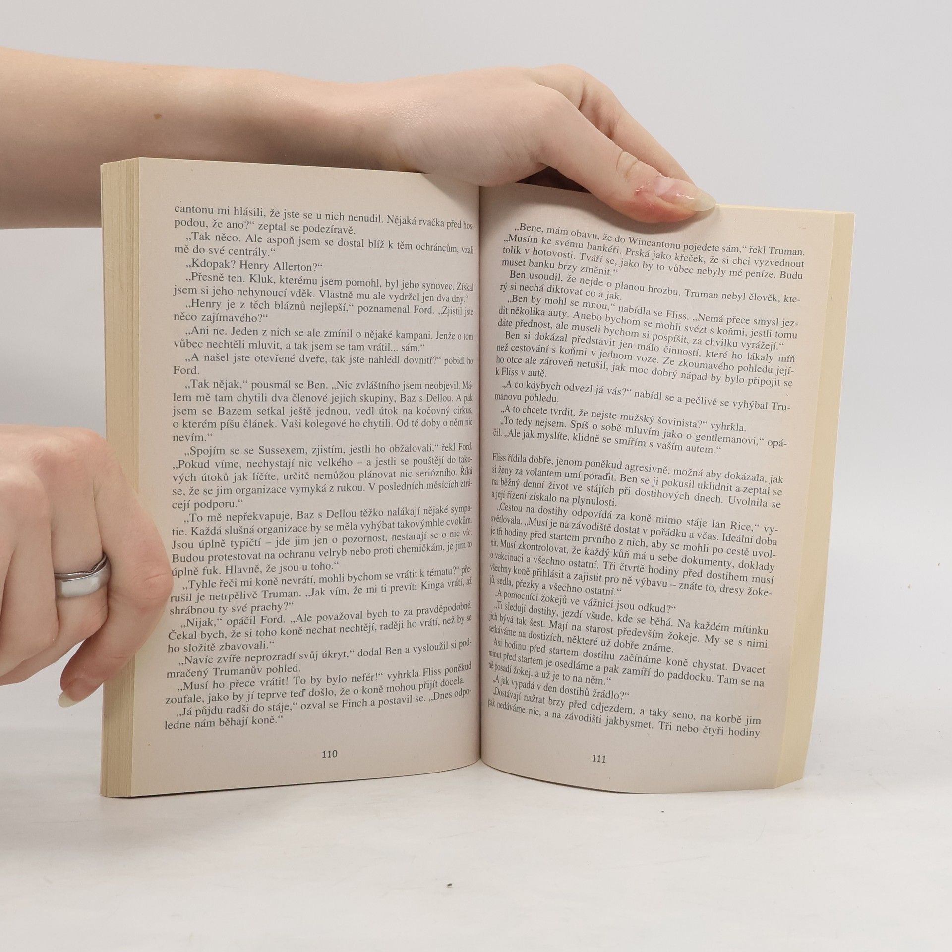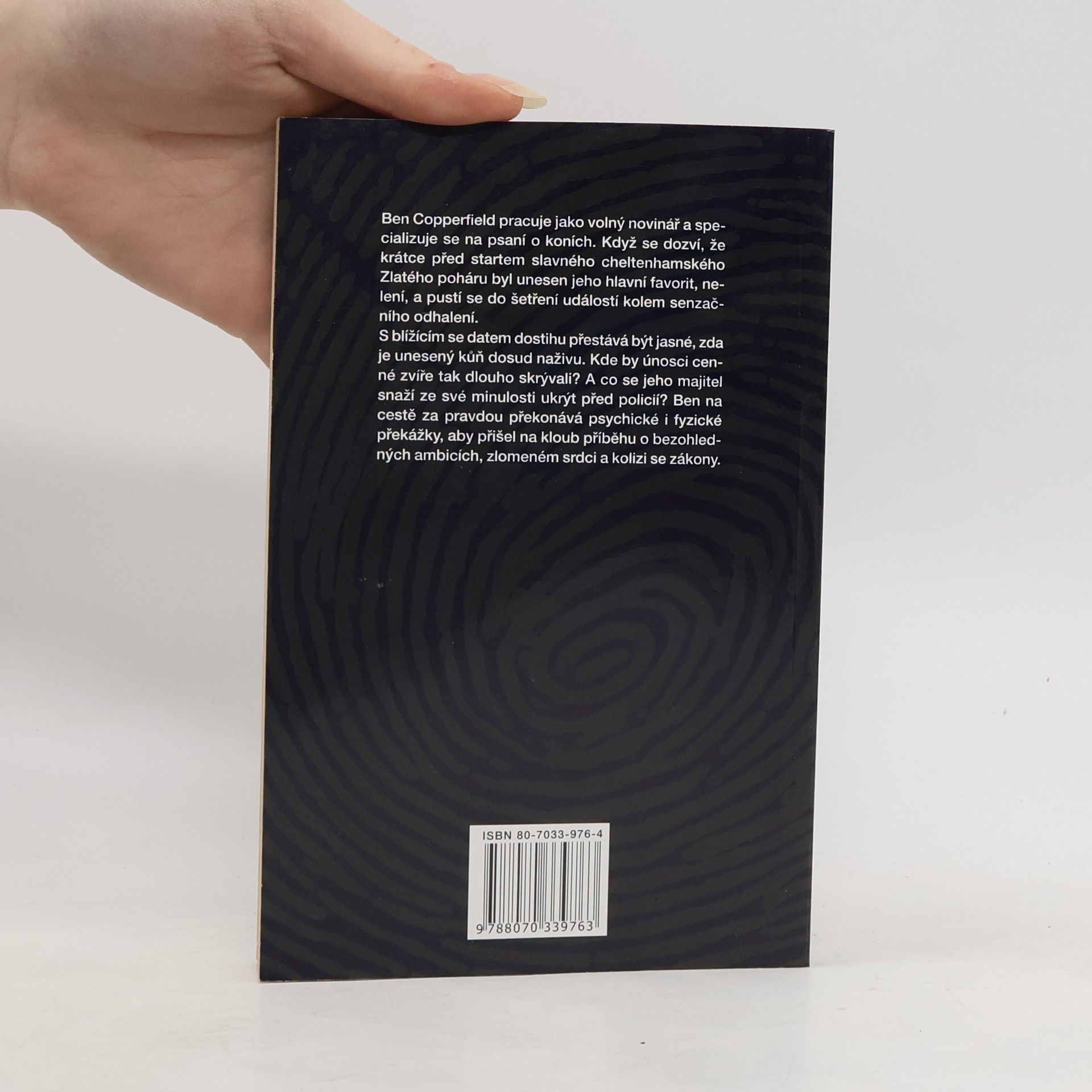 Čtvrtý román (Pomsta, Sám na stopě, Smrtelný pád) autorky, která je považována za nejlepší následovnici Dicka Francise. Ben Copperfield je nezávislý novinář, který se specializuje na všechno okolo koní, takže když se dozví, že žhavý kandidát na vítěze v Cheltenhamském Zlatém poháru byl unesen jen pár týdnů před závodem, neztrácí čas a pouští se do pátrání. Tohle by mohl být novinářský úlovek jeho života. Ale i když se den závodu kvapem přibližuje, stále není jasné, jestli ztracený kůň ještě žije. Kde by mohl být cenný závodní kůň schováván po tak dlouhou dobu? A jaké je tajemství majitelovi minulosti, které skrývá před policií? Tvrdošíjně se pídící po pravdě, prochází Ben zkouškou své psychiky i fyzické kondice a postupně odkrývá příběh plný předsudků, ambicí a zlomených srdcí.