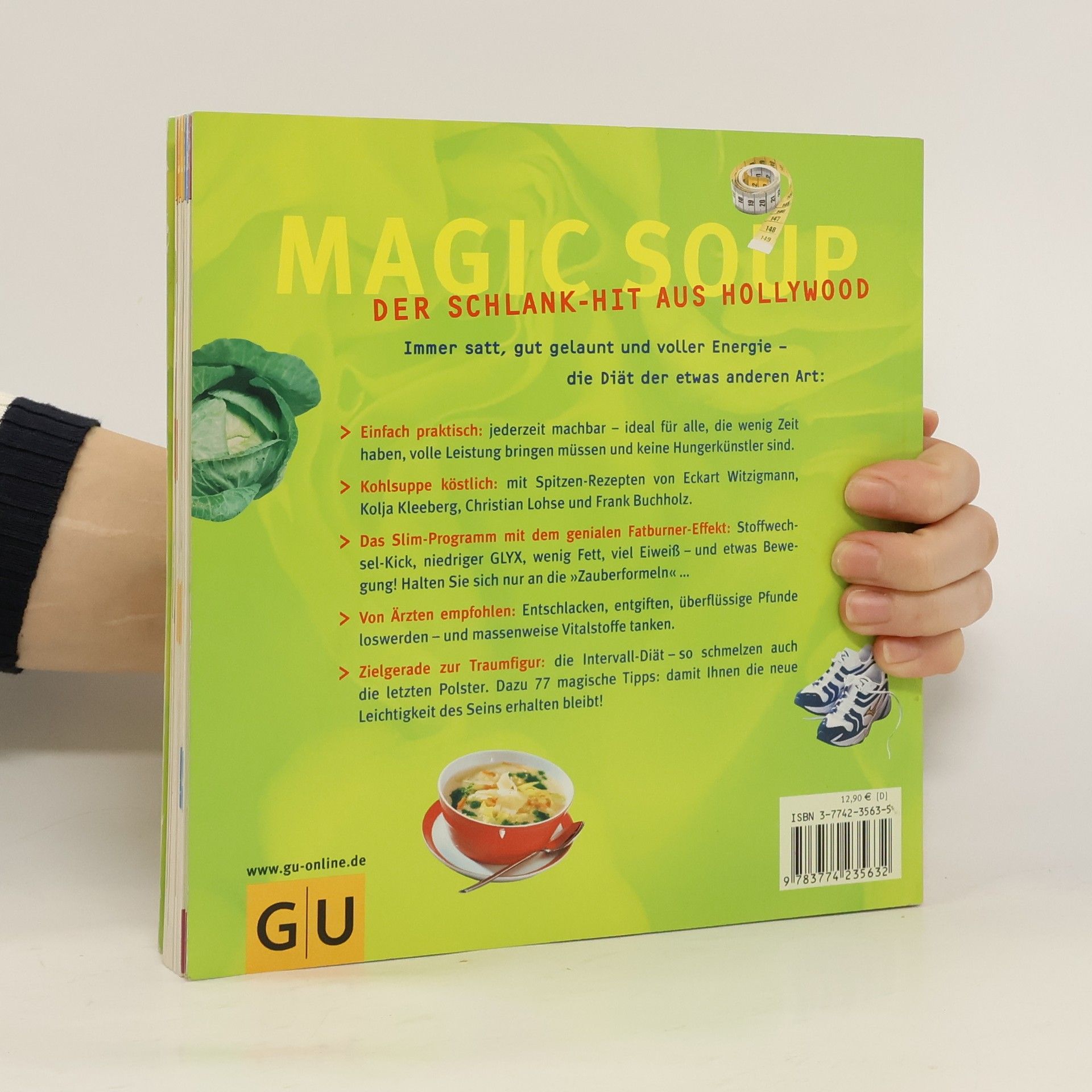 Mit Kohlsuppe lässt sich prima abnehmen. Sie ist gesund und schmeckt auch noch gut. Erfolgsautorin Marion Grillparzer erklärt in ihrem neuen Buch genau, wie die "magische Diät" funktioniert (niedriger GLYX, wenig Fett, viel Eiweiß). Die Sterneköche Witzigmann, Kleeberg, Lohse und Buchholz liefern die besten Kohlsuppenrezepte. Dazu kommen noch neue Rezepte aus aller Welt, damit einem bei der 7-Tage-Diät bestimmt nicht langweilig wird. Wer noch mehr Pfunde loswerden will, für den gibt es die ebenfalls 7 Tage dauernde Intervall-Diät, bei der abwechselnd Kohlsuppe und andere leckere Fatburner-Gerichte gegessen werden.