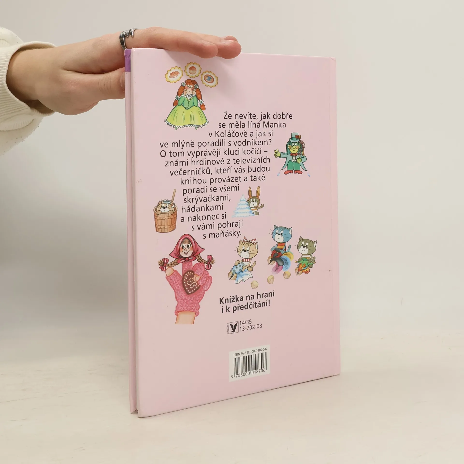 Že nevíte, jak dobře se měla Líná Manka v Koláčově a jak si ve mlýně poradili s vodníkem? O tom vám poví kluci kočičí - známí hrdinové z televizních večerníčků, kteří vás budou knihou provázet a také vám poradí se všemi skrývačkami i hádankami. Kdo je jen trošičku šikovný, nakonec si s nimi vyrobí maňásky z docela obyčejného pinpongového míčku a zahraje si pohádku!