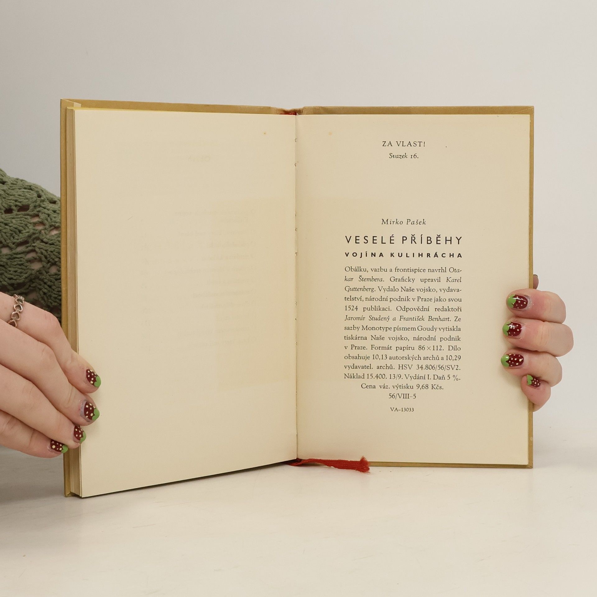 Mirko Pašek: Veselé příběhy vojína Kulihrácha. Obálku, vazbu a frontispice navrhl Otakar Štembera. Graficky upravil Karel Guttenberg. Kniha bez ilustrací. Vydal: Naše vojsko, vydavatelství, n. p., v Praze. Edice: "Za vlast!", svazek 16. Dílo obsahuje 10,13 autorských archů a 10,29 vydavatelských archů. Rok 1956, 1. vydání, cena vázaného výtisku: 9,68 Kčs.