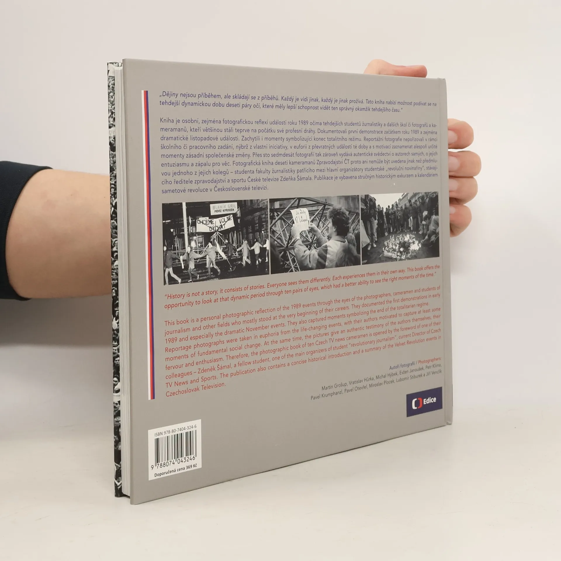 Dějiny nejsou příběhem, ale skládají se z příběhů, které každý prožívá jinak. Tato kniha nabízí pohled na dynamickou dobu roku 1989 očima deseti kameramanů a fotografů, kteří byli na začátku své profesní dráhy. Dokumentovali první demonstrace a dramatické listopadové události, zachycují symboly konce totalitního režimu, jako je odstraňování ostnatého drátu, volný průchod přes hranice, inauguraci Václava Havla a první svobodné volby. Jejich reportáže nebyly součástí školních či pracovních zadání, ale vznikly z vlastní iniciativy a euforie z převratných událostí. Více než sto sedmdesát fotografií tak poskytuje autentické svědectví o autorech, jejich entuziasmu a zápalu. Publikace je uvedena předmluvou Zdeňka Šámala, studenta žurnalistiky a organizátora studentské "revoluční novinařiny", nynějšího ředitele zpravodajství a sportu České televize. Kniha obsahuje český i anglický text a je doplněna stručným historickým exkurzem a kalendáriem sametové revoluce v Československé televizi.