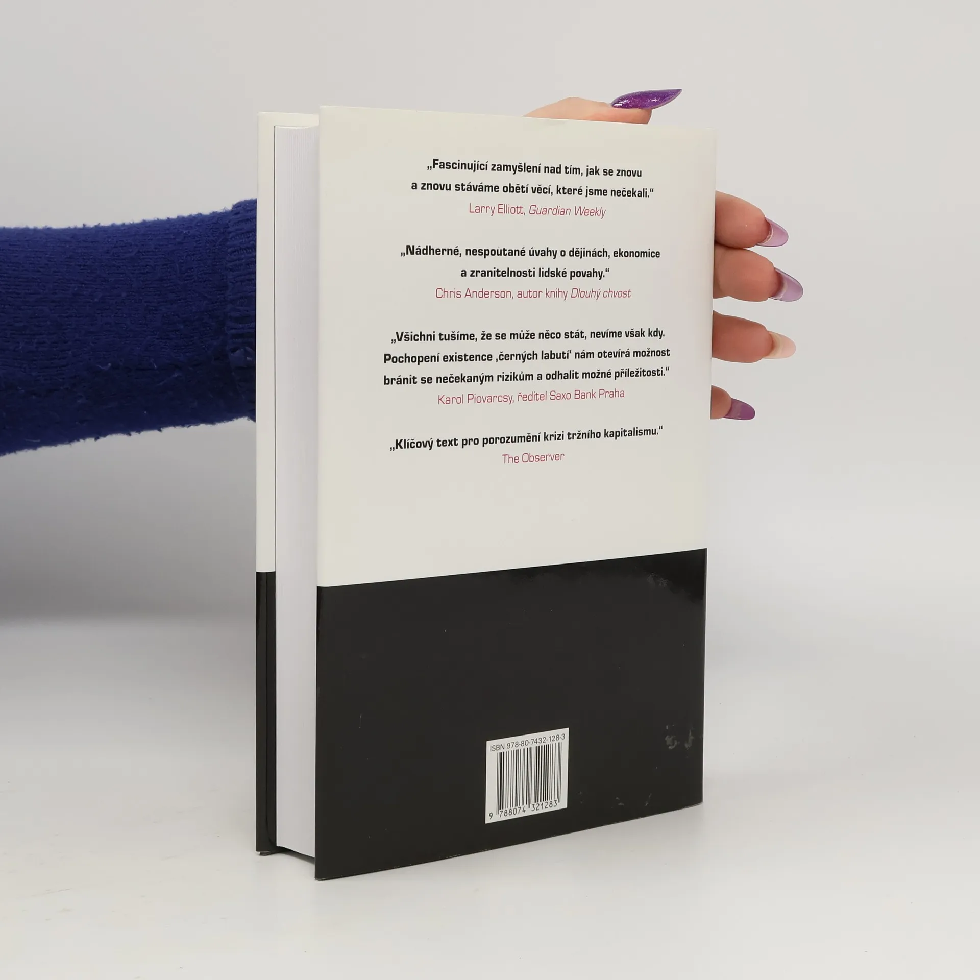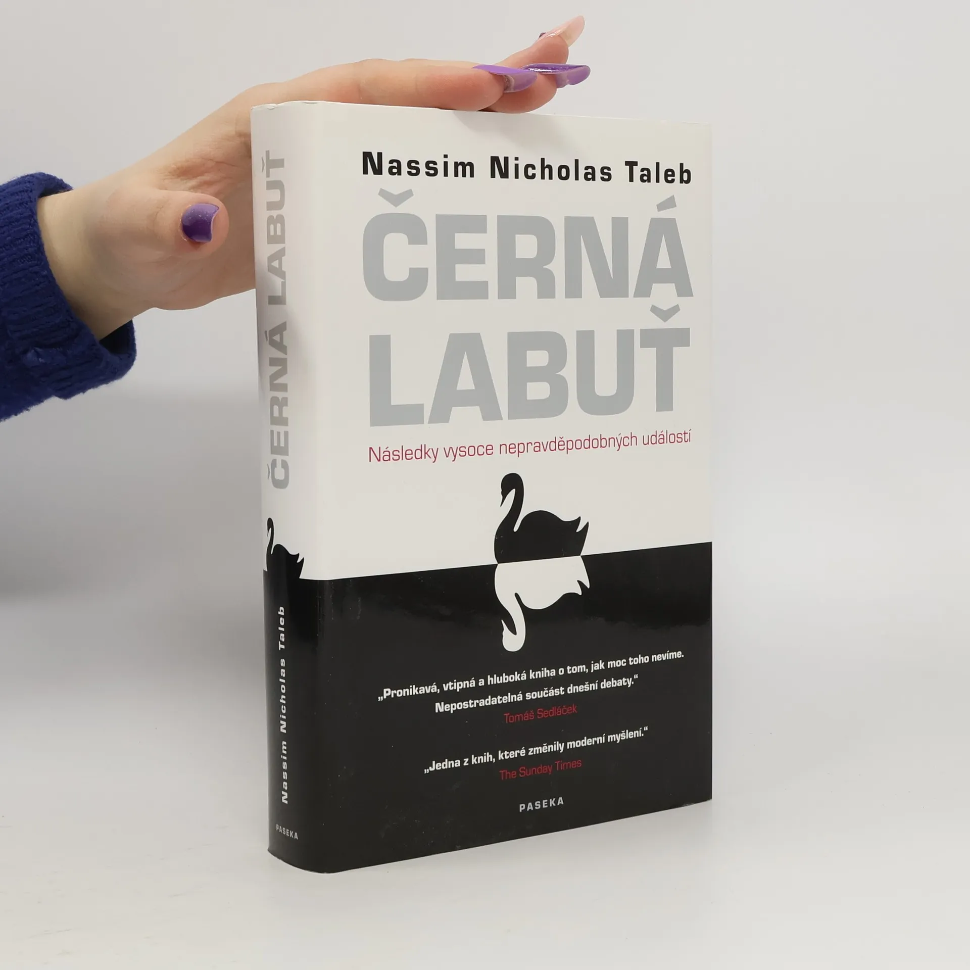 Následky vysoce nepravěpodobných událostí Bestseller amerického akademika a investičního poradce libanonského původu analyzuje fenomén „černých labutí“, tj. nepředvídaných jevů a událostí s významným dopadem na život jedince nebo celé společnosti, jakým byl např. teroristický útok z 11. září 2001, fenomenální úspěch společnosti Google či nedávná globální finanční a ekonomická krize. Autor – jeden z mála odborníků, kteří nástup krize předvídali – věří, že příčinou naší nepřipravenosti na podobné zlomové události je především setrvačnost našeho myšlení v podobě přílišné důvěry ve statistiky a prognostiky, přehnaného kategorizování, hledání „logiky“ vývoje či soustřeďování se na specifika tam, kde bychom měli přemýšlet spíše v obecných kontextech. Jeho kniha, vyzývající k tomu, abychom přehodnotili náš ustálený pohled na svět a přiznali si, jak málo o něm víme, patří dnes k nejdiskutovanějším pracím ve svém žánru, deníkem Times byla označena za jedno z nejvlivnějších děl posledních šedesáti let a díky autorovu širokému rozhledu, smyslu pro humor a zdravé provokativnosti je i velkým čtenářským zážitkem.
