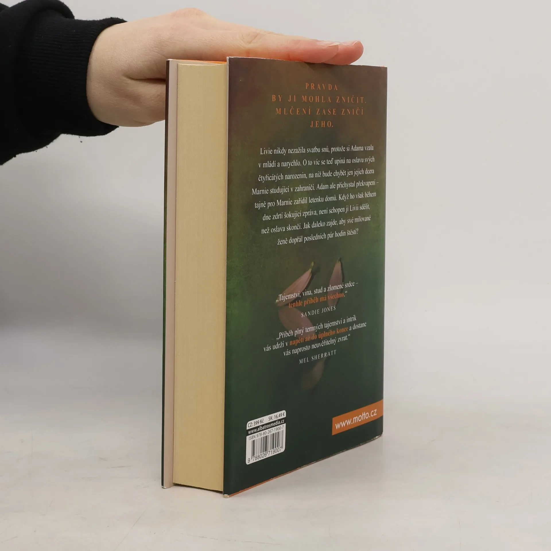 Pravda by ji mohla zničit. Mlčení zase zničí jeho. Livia nikdy nezažila svatbu snů, protože si Adama vzala v mládí a narychlo. O to víc se teď upíná na oslavu svých čtyřicátých narozenin, na níž bude chybět jen jejich dcera Marnie studující v zahraničí. Adam ale přichystal překvapení – tajně pro Marnie zařídil letenku domů. Když ho však během dne zdrtí šokující zpráva, není schopen ji Livii sdělit, než oslava skončí. Jak daleko zajde, aby své milované ženě dopřál posledních pár hodin štěstí?