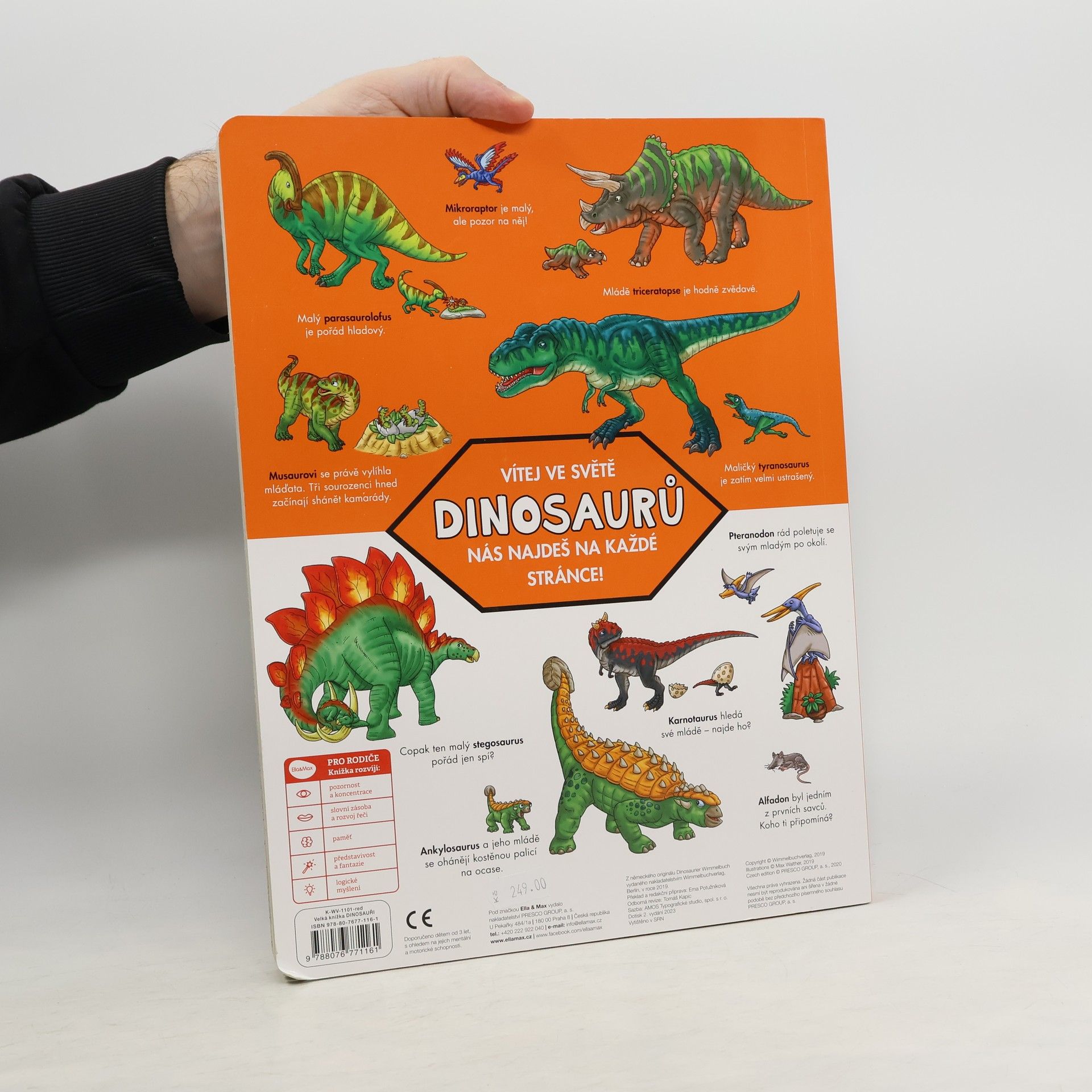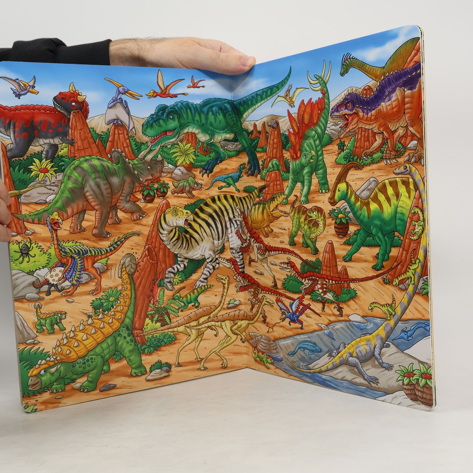 Velkoformátová obrázková kniha představuje pravěký svět dinosaurů a vybízí malé čtenáře k vyprávění.Knížka představuje rozmanité druhy dinosaurů. Odhaluje, jak se jedni dinosauři bránili útokům druhých a čím se živili. Na konci knihy najdeme kompletní seznam názvů vyobrazených dinosaurů.