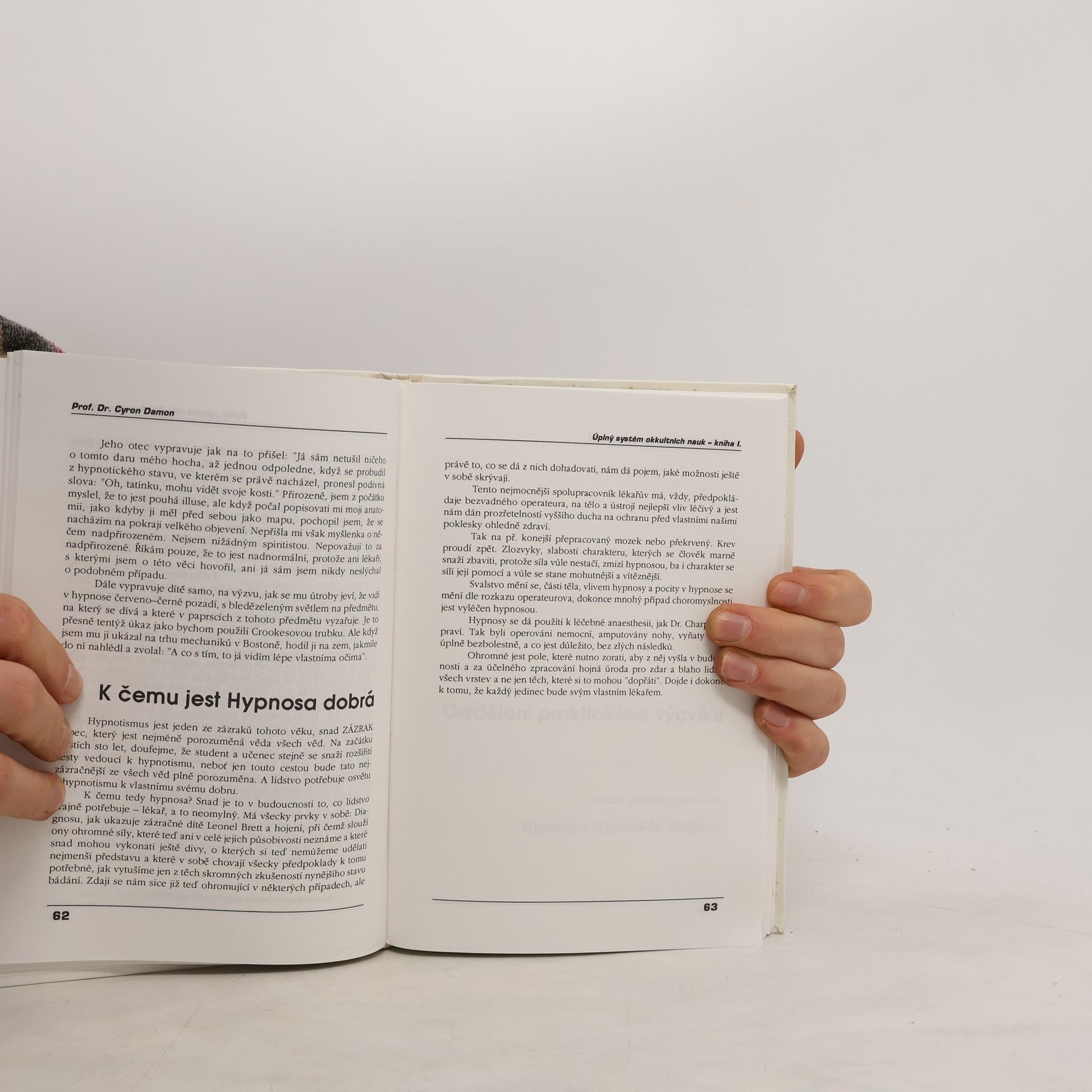 Úplný systém okkultních nauk dle původních přednášek Prof. Dr. Cyrona Damona pro české vydání zpracoval a zredigoval Nakladatel Kodym 1936 KNIHA I. ÚVOD DO PSYCHICKÝCH VĚD A NAUK o hypnotismu, suggesci, telepathii, osobním magnetismu, vývoji, o charakteru a probuzení utajených sil podvědomí KNIHA II. HYPNOTISMUS, telepathie, osobní magnetismus a ovládání lidí okkultními silami