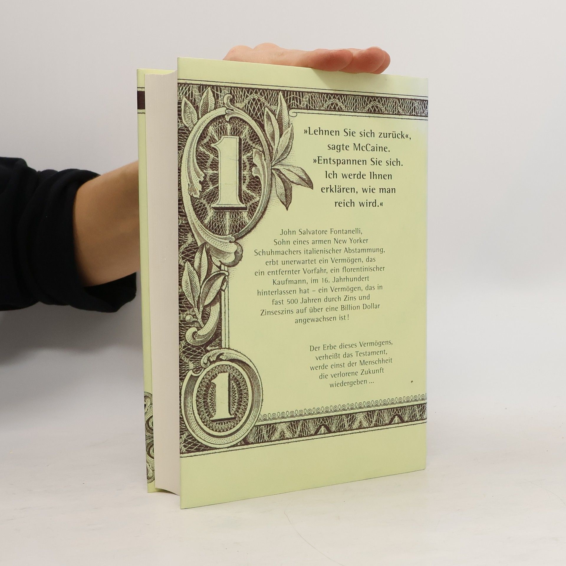 Gestern fuhr John Fontanelli noch Pizzas in New York aus. Heute ist er der reichste Mann der Welt. Reicher als Bill Gates. Reicher als der Sultan von Brunei. Reicher als die britische Königin. Reicher als die zweihundert reichsten Menschen der Erde - zusammen. Eine Billion Dollar. Eine Million Millionen. Mehr Geld, als man sich überhaupt vorstellen kann. Dieses Vermögen hat die italienische Anwaltsfamilie Vacchi fünfhundert Jahre lang angehäuft und bis zu jenem Tag verwaltet, den der Stifter in seinem Testament festgelegt hatte. Und mit diesem Geld kann John machen, was er will. Als Erstes kauft er sich einen Ferrari. „Was wäre, wenn ich mir jetzt nur noch Ferraris kaufen würde?”, fragt er den alten Anwalt. “So viele Ferraris gibt es nicht”, lautet die Antwort. Er legt sich Leibwächter zu und einen Stab von Mitarbeitern, um die anschwellende Korrespondenz zu bewältigen. Er verhandelt mit dem italienischen Finanzminister. Ein leibhaftiger Kardinal kommt als Bittsteller an seine Tür. Die schönsten Frauen liegen ihm zu Füßen. Aber kann er noch irgendjemandem trauen? Und dann erhält er einen Anruf von einem geheimnisvollen Fremden. Sein Name ist Malcolm McCaine, und er behauptet zu wissen, was es mit dem Geld auf sich hat - und wie es verwendet werden soll. Doch welcher Plan steckt hinter der Stiftung des Giacomo Fontanelli, und ist John wirklich dazu ausersehen, ihn zu erfüllen?