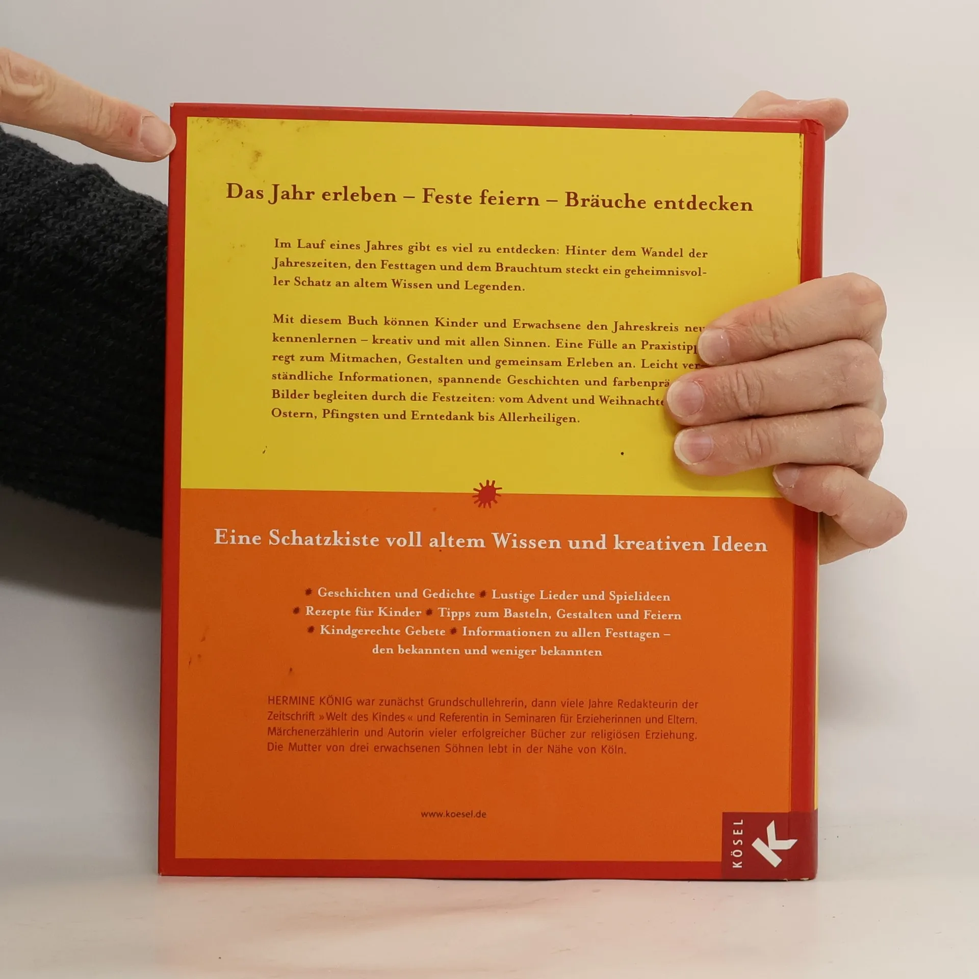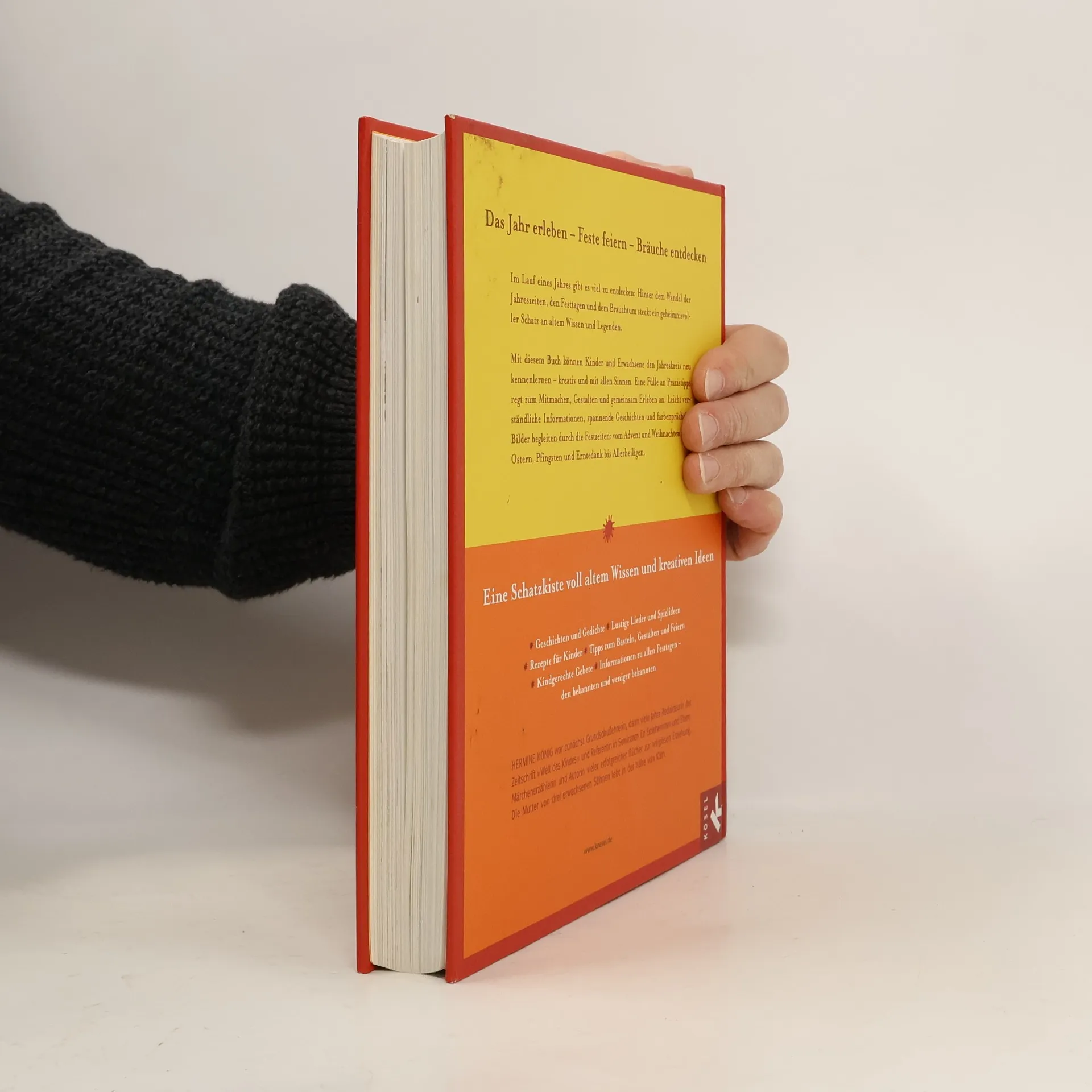 Lebendiges Brauchtum für Familie und Kindergarten Mit seiner einzigartigen Vielfalt von Anregungen bleibt das große Jahresbuch von Hermine König unübertroffen: Seit vielen Jahren begleitet es Kinder und Erwachsene durch den ganzen Jahreskreis – mit all seinen Festen und Bräuchen. Das Jahresbuch hat seinen Platz in Familien genauso wie in Kindergärten und Schulen. Die Neuausgabe 2007 bietet: • ein neues Layout: modern, übersichtlich und abwechslungsreich, • kräftige Farben zur leichteren Orientierung für die Kinder, • eine große Anzahl neuer bunter Illustrationen, • neue Lieder, Gedichte und Geschichten, • die bewährte Zusammenstellung von kindgerechten Sachtexten, Legenden aus alter Zeit, Gebeten, Tipps zum Basteln, Spielen, Backen und vieles mehr. Eine Schatzkiste voll mit altem Wissen und kreativen neuen Ideen – ein einmaliges Geschenk, besonders zur Erstkommunion. Ausstattung: Mit Illustr.
