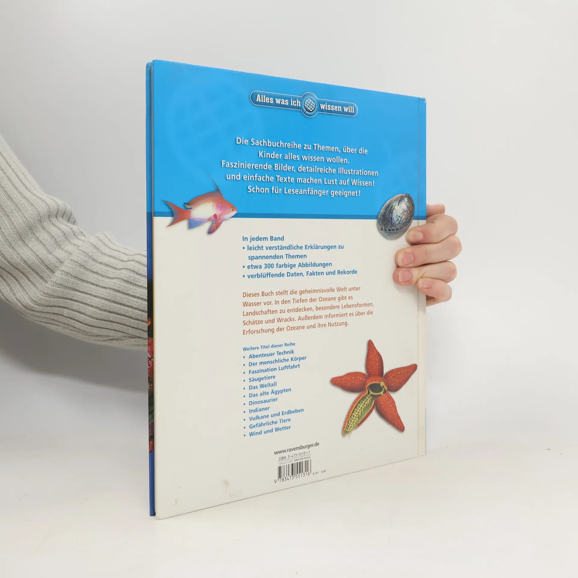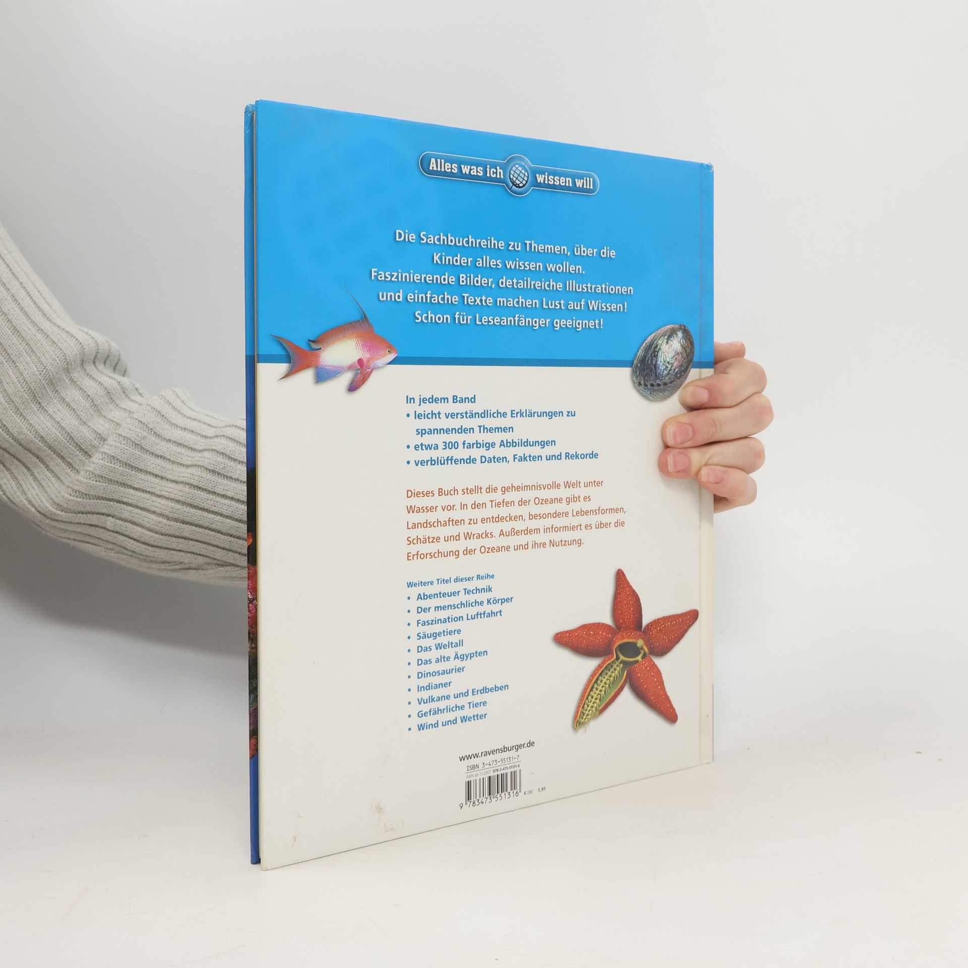 Dieses Buch führt in die geheimnisvolle Welt unter Wasser. Es lässt in den Tiefen der Ozeane Landschaften entdecken, besondere Lebensformen, Schätze und Wracks. Außerdem: die Erforschung der Ozeane und ihre Nutzung.