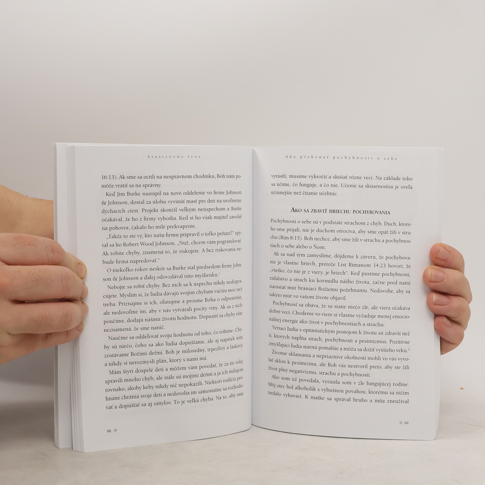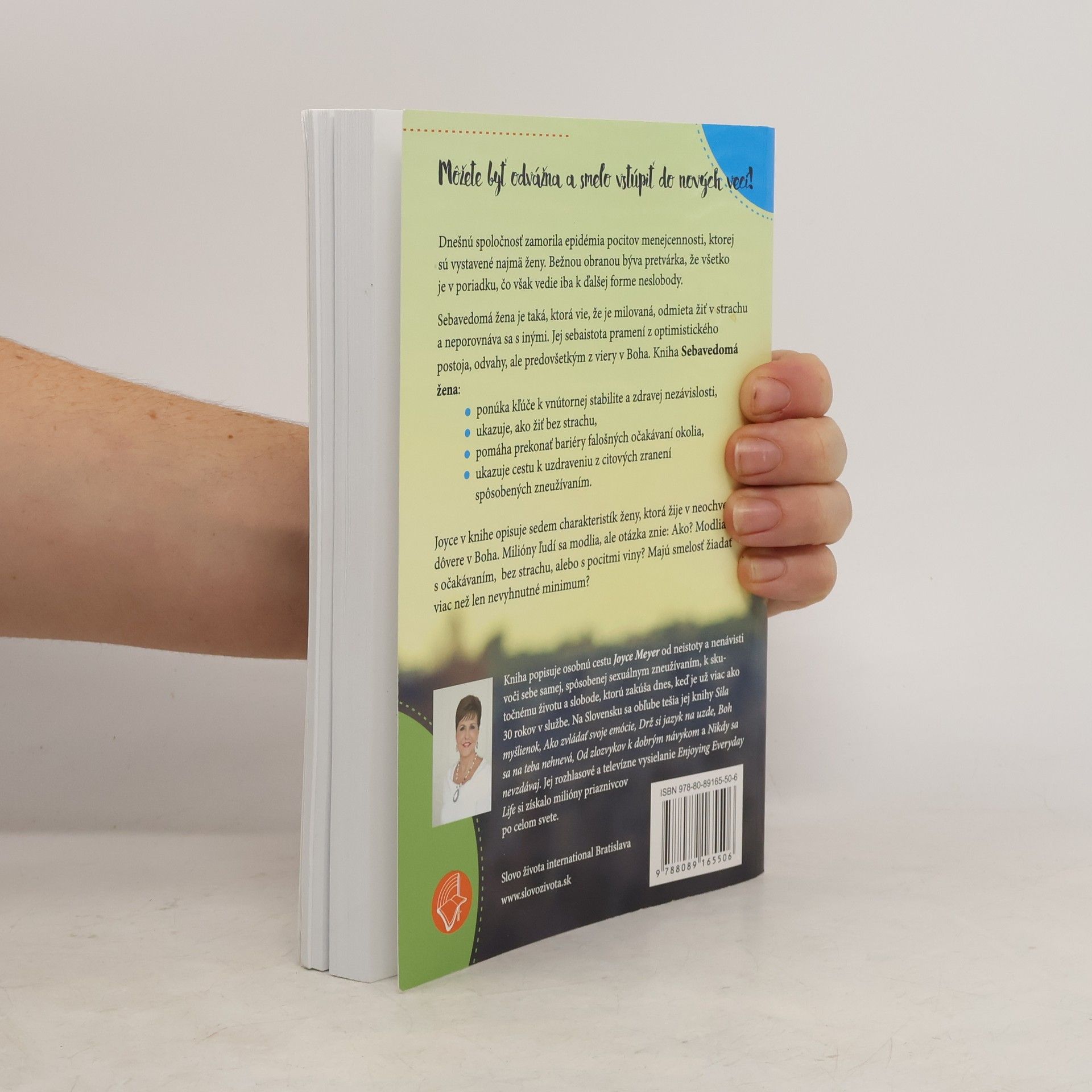 Dnešnú spoločnosť zamorila epidémia pocitov menejcennosti, ktorej sú vystavené najmä ženy. Bežnou obranou býva pretvárka, že všetko je v poriadku, čo však vedie iba k ďalšej forme neslobody. Sebavedomá žena je taká, ktorá vie, že je milovaná, odmieta žiť v strachu a neporovnáva sa s inými. Jej sebaistota pramení z optimistického postoja, odvahy, ale predovšetkým z viery v Boha. Kniha Sebavedomá žena: • ponúka kľúče k vnútornej stabilite a zdravej nezávislosti • ukazuje, ako žiť bez strachu • pomáha prekonať bariéry falošných očakávaní okolia • ukazuje cestu k uzdraveniu z citových zranení spôsobených zneužívaním Joyce v knihe opisuje sedem charakteristík ženy, ktorá žije v neochvejnej dôvere v Boha. Milióny ľudí sa modlia, ale otázka znie: Ako? Modlia sa s očakávaním, bez strachu, alebo s pocitmi viny? Majú smelosť žiadať viac než len nevyhnutné minimum? Kniha popisuje osobnú cestu Joyce Meyer od neistoty a nenávisti voči sebe samej, spôsobenej sexuálnym zneužívaním, k skutočnému životu a slobode, ktorú zakúša dnes, keď je už viac ako 30 rokov v službe.
