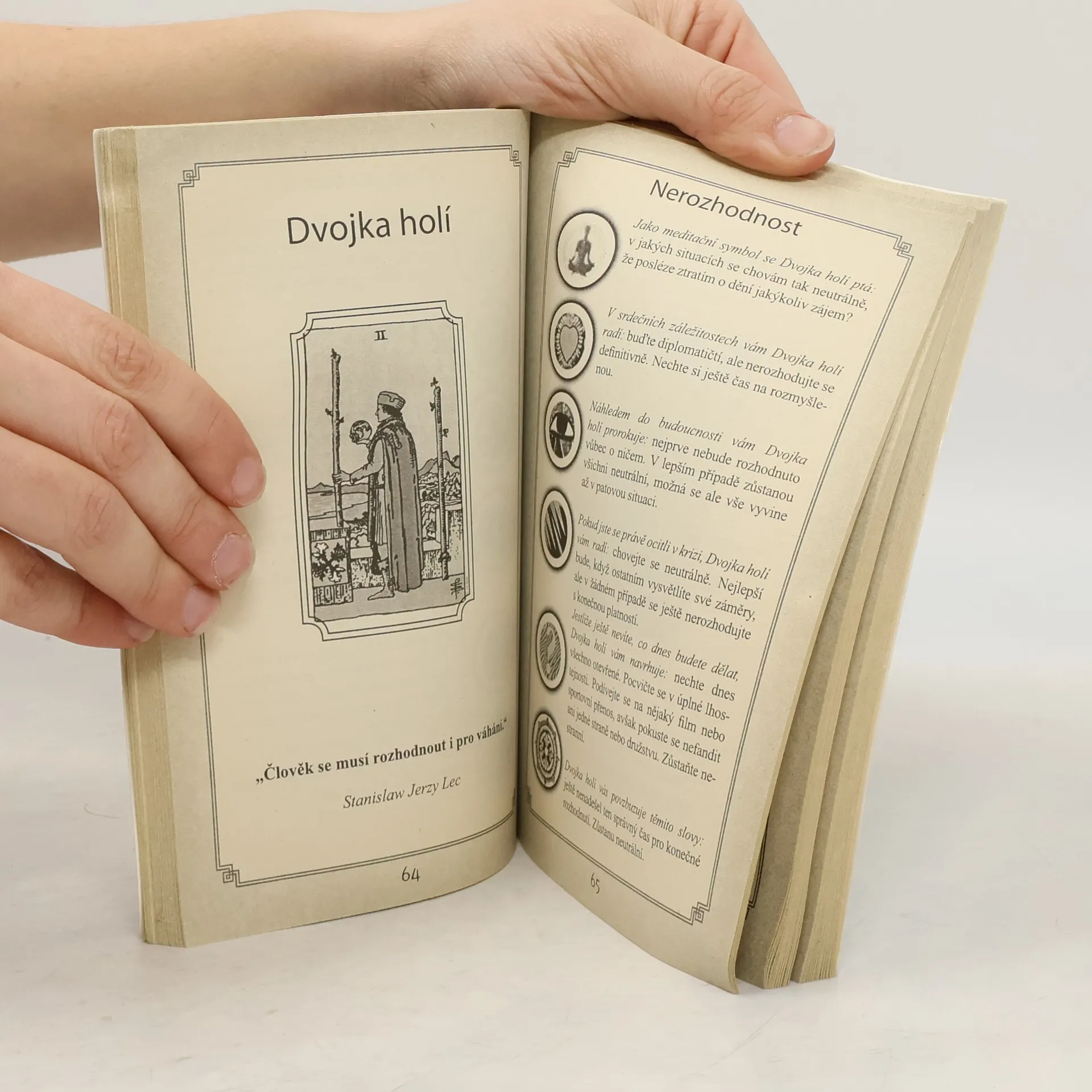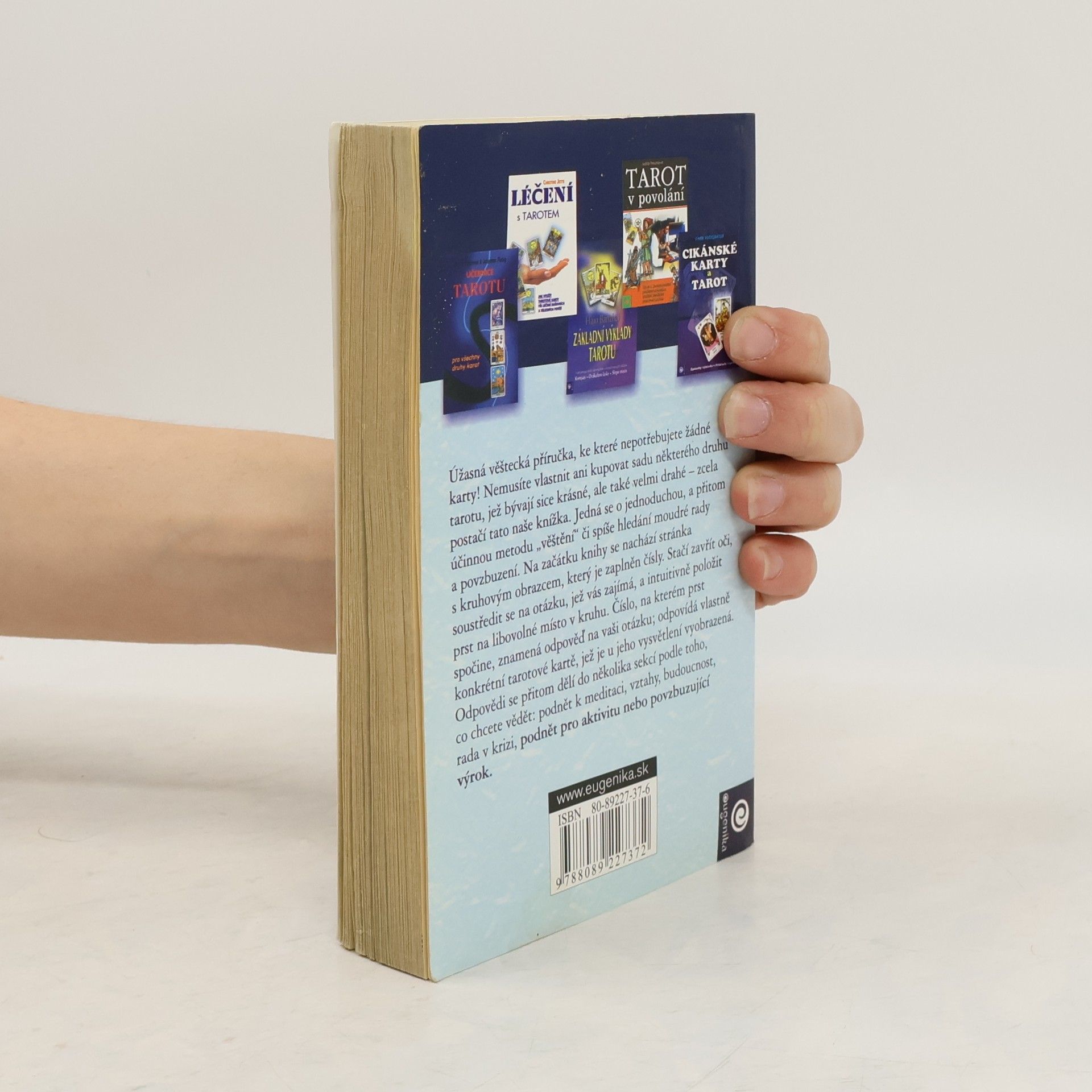 Magie - Crowley Úžasná věštecká příručka, ke které nepotřebujete žádné karty! Nemusíte vlastnit ani kupovat sadu některého druhu tarotu, jež bývají sice krásné, ale taky velmi drahé - zcela postačí tato naše knížka. Jedná se o jednoduchou, a přitom účinnou metodu "věštění" či spíše hledání moudré rady a povzbuzení. Na začátku knihy se nachází stránka s kruhovým obrazcem, který je zaplněn čísly. Stačí zavřít oči, soustředit se na otázku, jež vás zajímá, a intuitivně položit prst na libovolné místo v kruhu. Číslo, na kterém prst spočine, znamená odpověď na vaši otázku. odpovídá vlastně konkrétní tarotové kartě, jež je u jeho vysvětlení vyobrazená. Odpovědi se přitom dělí do několika sekcí podle toho, co chcete vědět: podnět k meditaci, vztahy, budoucnost, rada v krizi, podnět pro aktivitu nebo povzbuzující výrok.