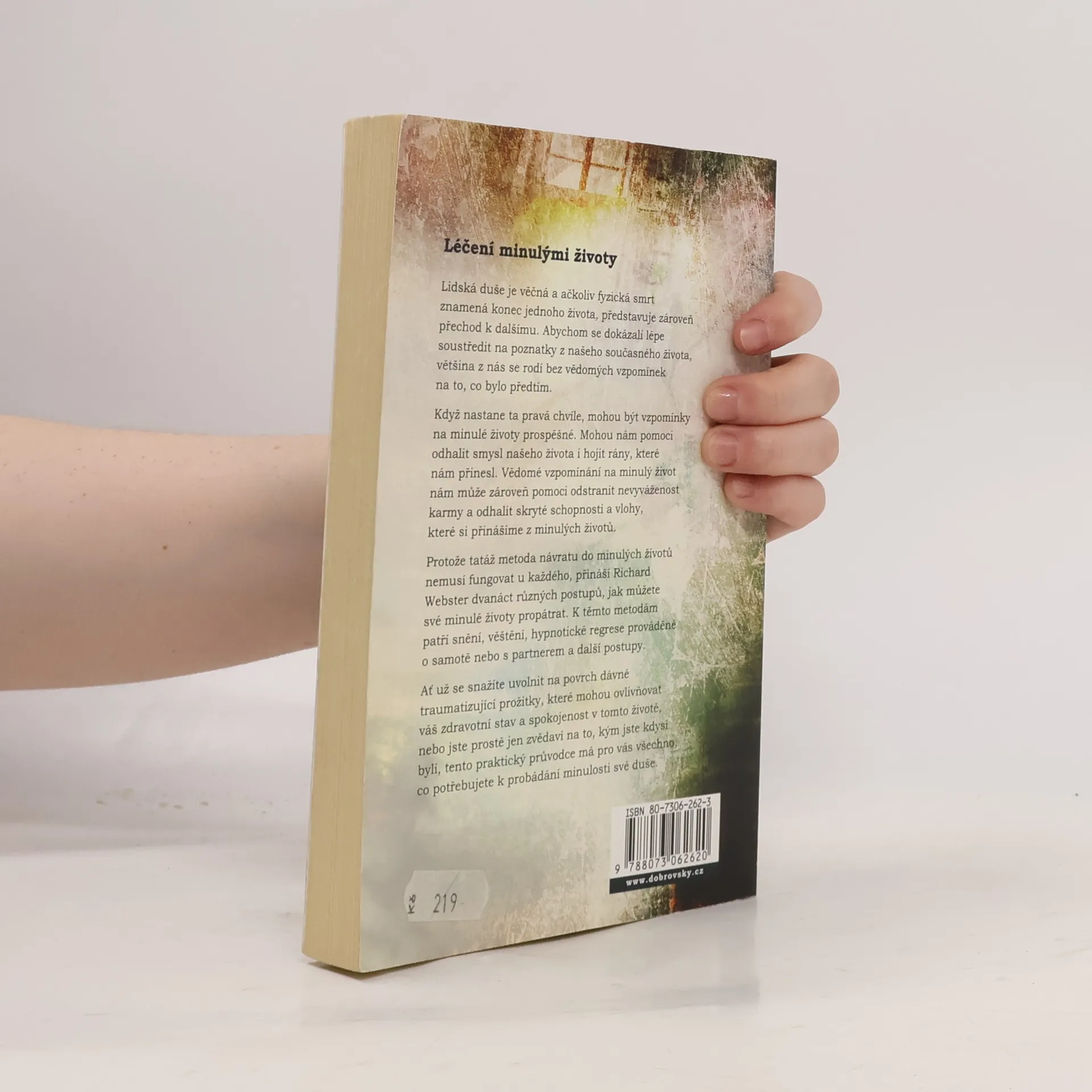 Probádejte minulost své duše Lidská duše je věčná a ačkoliv fyzická smrt znamená konec jednoho života, představuje zároveň přechod k dalšímu. Obsah: 1. Spousta minulých životů; 2. Příprava; 3. Karma; 4. Sny o minulých životech; 5. Vzálená paměť; 6. Vyvolávání minulého života; 7. Věštění z minulých životů; 8. Postupná regrese; 9. Zaujetí, dovednosti a zájmy; 10. Hádání z minulých životů; 11. Číselná meditace s duhou; 12. Imaginativní meditace; 13. Hledání v podvědomí; 14. Pocitová technika; 15. S pomocí průvodců Abychom se dokázali lépe soustředit na poznatky z našeho současného života, většina z nás se rodí bez vědomých vzpomínek na to, co bylo předtím. Kniha přináší dvanáct způsobů, jak své minulé životy vědomě propátrat.