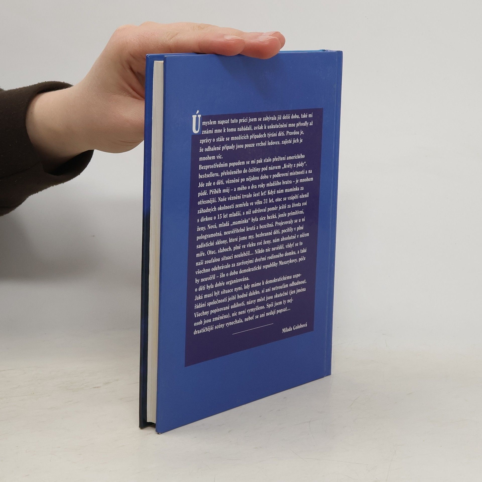 Skutečný příběh dětí, které neměly přežít Autentický příběh o týrání dětí je inspirován případy, které byly soustředěny v záznamech pracovníků Fondu ohrožených dětí. Autorka líčí vlastní životní příběh sirotka, vychovávaného macechou. Po smrti matky se otec oženil s mnohem mladší, primitivní ženou, která se za každou cenu chtěla dětí zbavit a spolu s otcem, který jí bezvýhradně podléhal, je vystavila kruté izolaci a tělesnému týrání. Celých šest let zůstalo jednání rodičů jejich okolí utajeno a až umístění v Masarykově dětské léčebně v Šumperku přineslo dětem vysvobození.... celý text