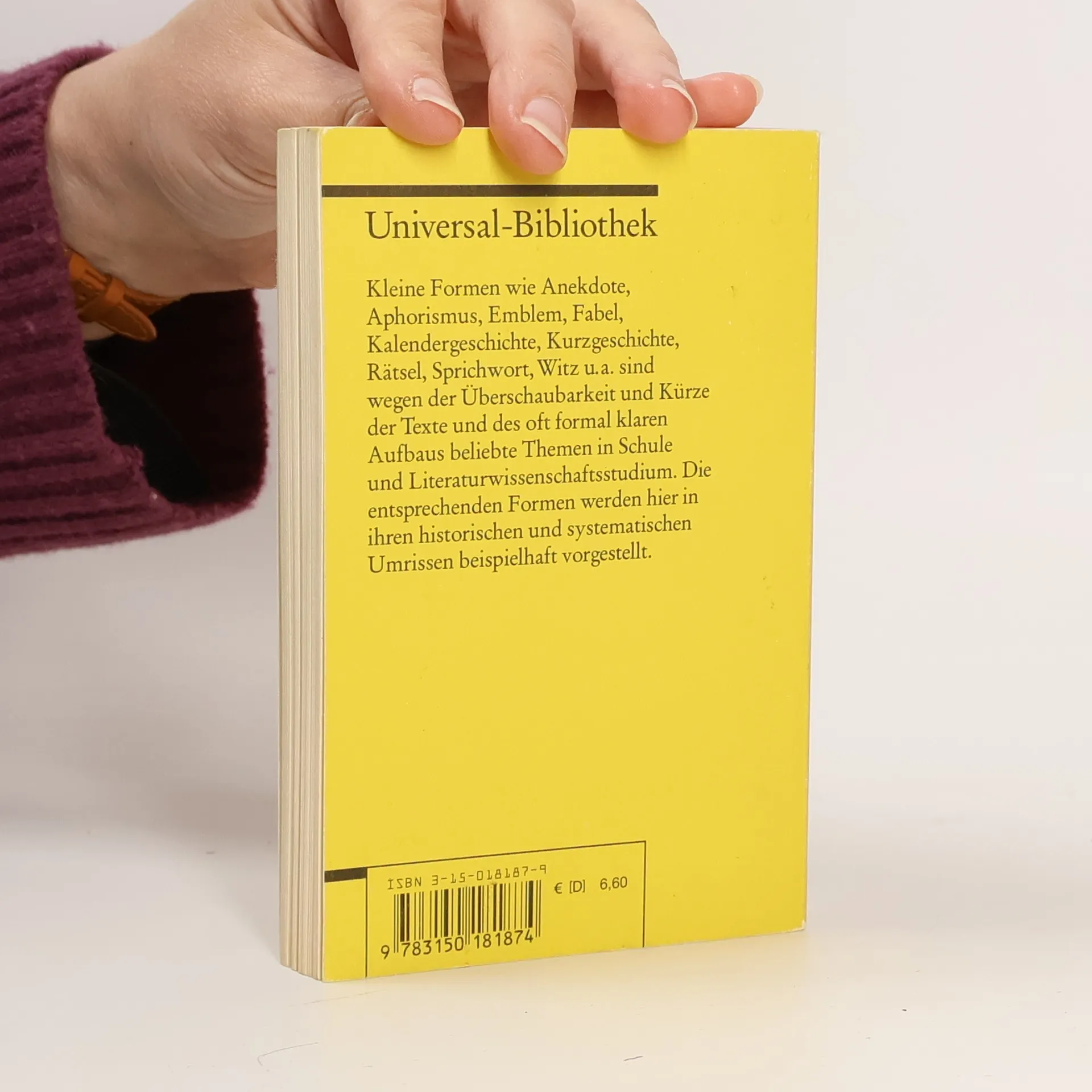 In der Kürze liegt die Würze - das gilt auch für die Literatur. Dieser Band stellt die wichtigsten kleinen Formen in ihren jeweiligen historischen und systematischen Umrissen vor: Anekdote - Aphorismus - Bîspel - Emblem - Fabel - Kalendergeschichte - Kurzgeschichte - Verserzählung - Parabel, Lehrgedicht, Gleichnis - Rätsel - Sprichwort - Witz - Lyrische Kleinformen.