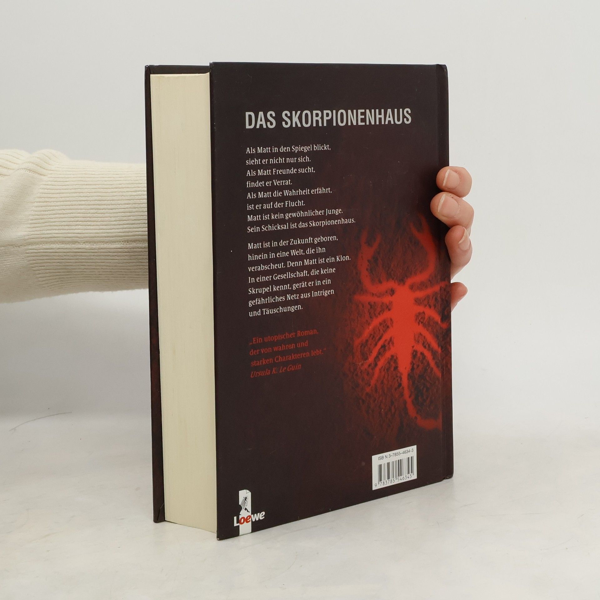Als Matt in den Spiegel blickt, sieht er nicht nur sich. Als Matt Freunde sucht, findet er Verrat. Als Matt die Wahrheit erfährt, ist er auf der Flucht. Matt ist kein gewöhnlicher Junge Sein Schicksal ist das Skorpionenhaus. Matt ist in der Zukunft geboren, hinein in eine Welt, die ihn verabscheut. Denn Matt ist ein Klon. In einer Gesellschaft, die keine Skrupel kennt, gerät er in ein gefährliches Netz aus Intrigen und Täuschungen. „Ein utopischer Roman, der von wahren und starken Charakteren lebt - Menschen, die sich wirklich um andere sorgen, Kinder, die unsicher und verletzlich sind, mächtige Diktatoren, die man bedauern muss, charakterstarke und sympathische Menschen, die schreckliche Fehler machen.“ Ursula K. Le Guin Die Amerikanische Originalausgabe von „Das Skorpionenhaus“ wurde im Oktober 2002 mit dem „National Book Award“, dem wichtigsten amerikanischen Literaturpreis, ausgezeichnet. Im Oktober 2004 wurde „Das Skorpionenhaus“ mit dem „Buxtehuder Bullen“ als bestes Jugendbuch des Jahres 2003 ausgez