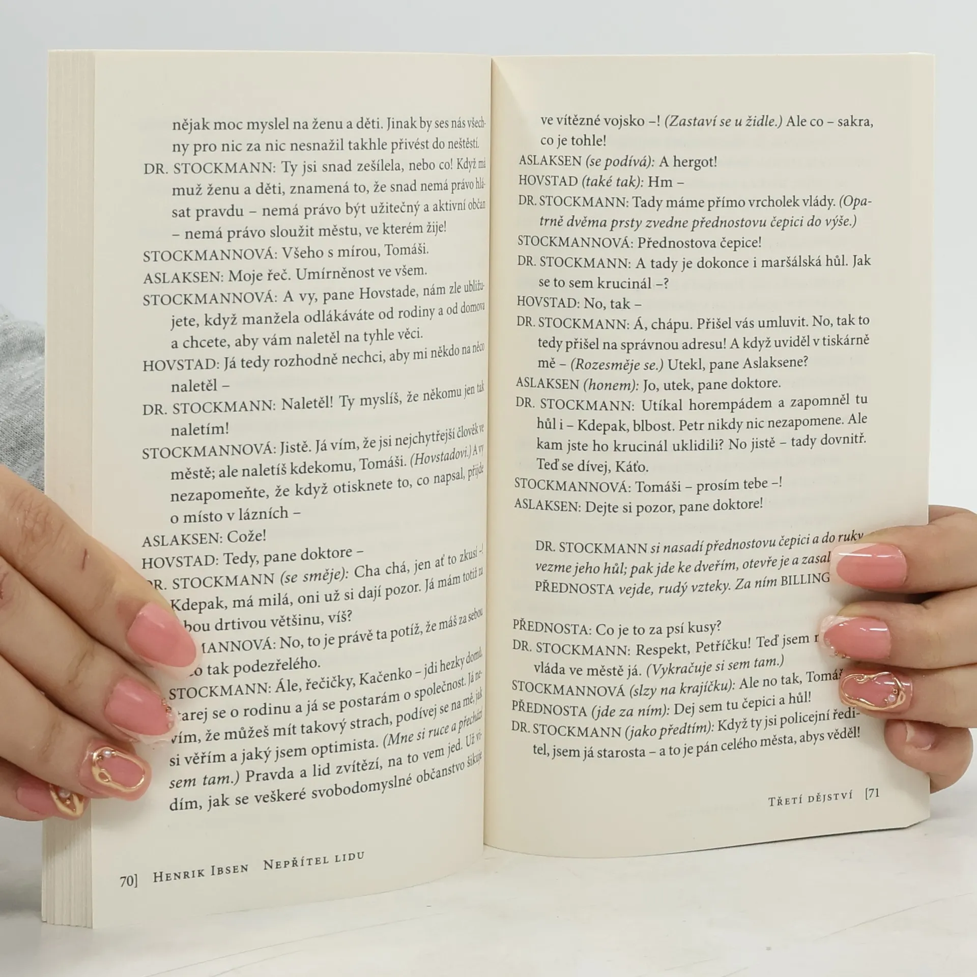 Dr. Stockmann, lékař v lázeňském městečku, zjistí, že léčivá voda je znečištěná a ohrožuje zdraví pacientů. Za svým zjištěním, které má potvrzené výsledky z laboratoře, si rázně stojí. Nepočítá ovšem s tím, jak jeho zjištění i pevný postoj rozbouří život v městečku. Střetnou se zájmy skupin obyvatel a představitelů obce a lázní. Svou roli hrají i proměnlivé postoje „nezávislého tisku“. Ibsenův pohled na svět, kde ani demokracie nezaručuje, že se pravda prosadí proti soukromým zájmům, je nelítostný. Vychází jako 175. svazek edice D v překladu Františka Fröhlicha.