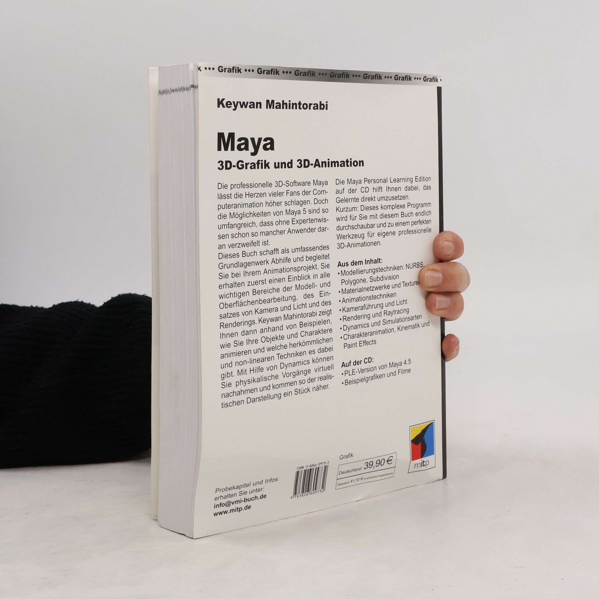 Die professionelle 3D-Software Maya lässt die Herzen vieler Fans der Computeranimation höher schlagen. Doch die Möglichkeiten von Maya 5 sind so umfangreich, dass ohne Expertenwissen schon so mancher Anwender daran verzweifelt ist. Dieses Buch schafft als umfassendes Grundlagenwerk Abhilfe und begleitet Sie bei Ihrem Animationsprojekt. Sie erhalten zuerst tiefen Einblick in alle wichtigen Bereiche der Modell- und Oberflächenbearbeitung, des Einsatzes von Kamera und Licht und des Rederings. Keywan Mahintorabi zeigt Ihnen dann anhand von Beispielen, wie Sie Ihre Objekte und Charaktere animieren und welche herkömmlichen und non-linearen Techniken es dabei gibt. Mit Hilfe von Dynamics können Sie physikalische Vorgänge virtuell nachahmen und kommen so der realistischen Darstellung ein Stück näher. Die Maya Personal Learning Edition auf der CD hilft Ihnen dabei, das Gelernte direkt umzusetzen. Kurzum: Dieses komplexe Programm wird für Sie mit diesem Buch endlich durchschaubar und zu einem perfekten Werkzeug für eigene professionelle 3D-Animationen. Aus dem Inhalt: - Modelierungstechniken: NURBS, Polygone, Subdivision - Materialnetzwerke und Texturen - Animationstechniken - Kameraführung und Licht - Rendering und Raytracing - Dynamics und Simulationsarten - Charakteranimation, Kinematik und Paint Effects