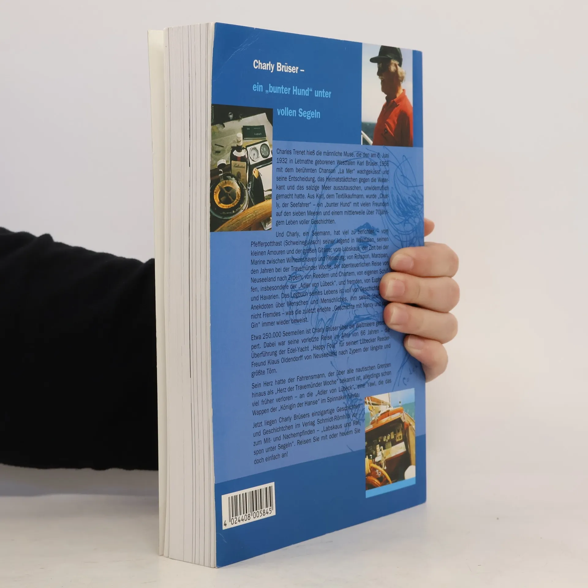 Charly Brüser, 1932 in Letmathe geboren, entschied sich 1956 für die Waterkant. Der Seemann, über alle nautischen Grenzen hinaus bekannt als das „Herz der Travemünder Woche“, hat viel zu berichten: von seiner Jugend in Westfalen, seinen kleinen Amouren, von seiner Zeit bei der Marine zwischen Wilhelmshaven und Flensburg, von Reedern und Chartern, von eigenen Schiffen, wie z. B. der „Adler von Lübeck“ u. v. m. Das Logbuch seines Lebens ist voll von Geschichten und Anekdoten über Menschen und Menschliches. Etwa 250.000 Seemeilen ist Charly Brüser über die Weltmeere geschippert; seine vorletzte Reise trat er im Alter von 66 Jahren an - die Überführung der Edelyacht „Happy Four“ für seinen Lübecker Reeder-Freund Klaus Oldendorff, von Neuseeland nach Zypern.